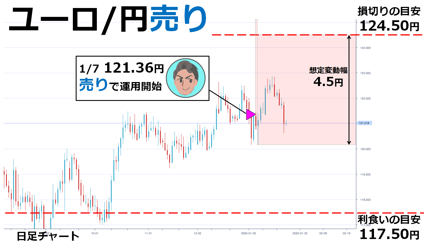 1/17に予想した短期レンジの下限値121.50円を下抜けて、想定外の動きとなったけど、売り設定で利食い回数が増えたから、収益は想定通りとなったよ。