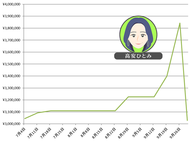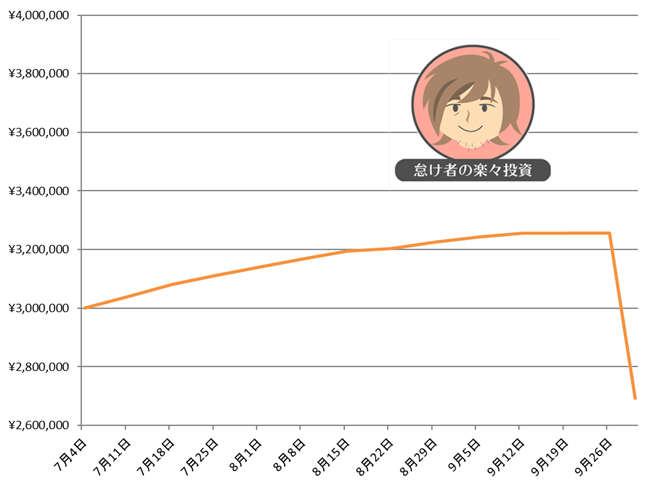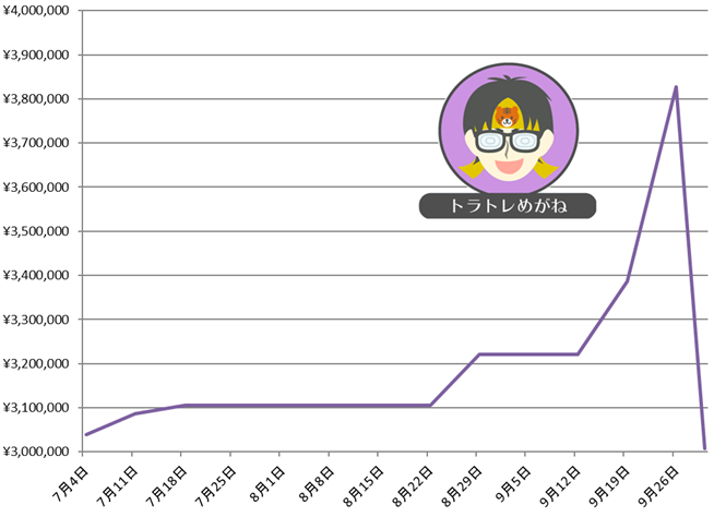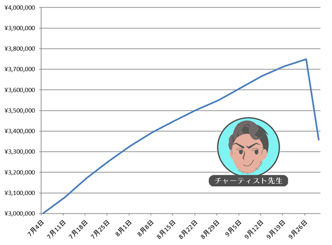 期間 累計実現損益 7月1日~7月3日 ±0円 7月4日~7月10日 +77,808円 7月11日~7月17日 +93,264円 7月18日~7月24日 +82,682円 7月25日~7月31日 +75,913円 8月1日~8月7日 +65,000円 8月8日~8月14日 +56,486円 8月15日~8月21日 +52,150円 8月22日~8月28日 +46,018円 8月29日~9月4日 +60,406円 9月5日~9月11日 +59,190円 9月12日~9月18日 +45,499円 9月19日~9月25日 +35,196円 9月26日~9月30日 -391,675円