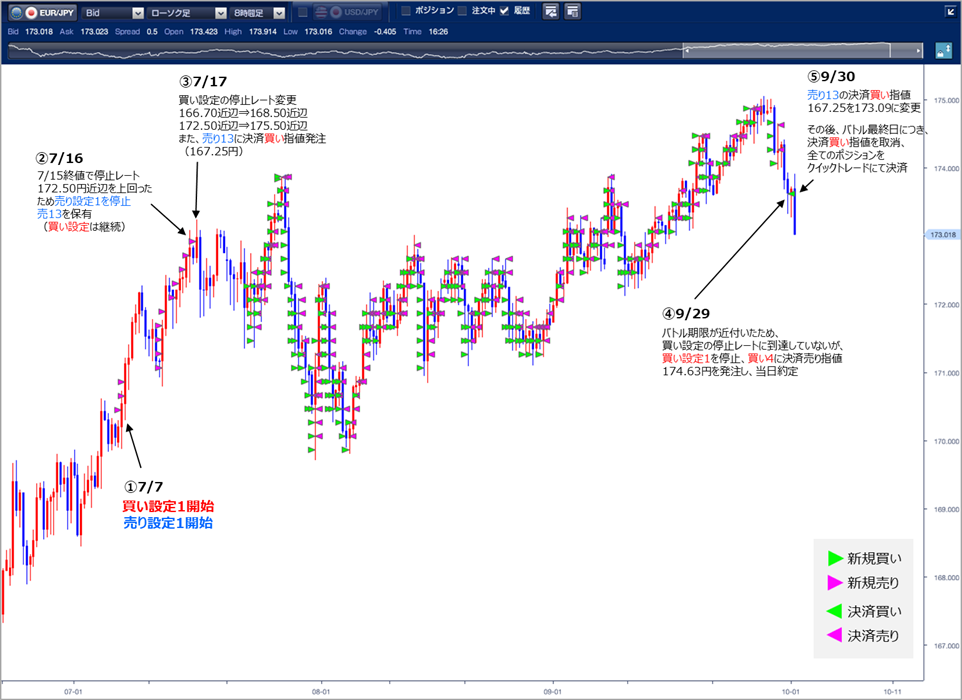 - バトル終了まで、あと1日となりましたので、停止レートに到達していませんが、運用中のユーロ円買い設定を停止しました。