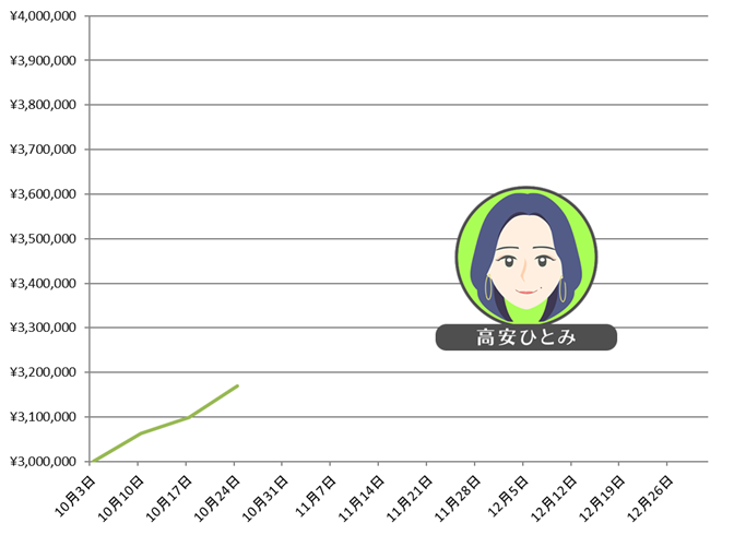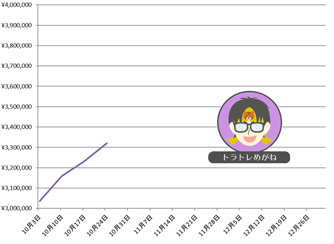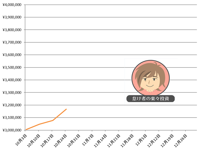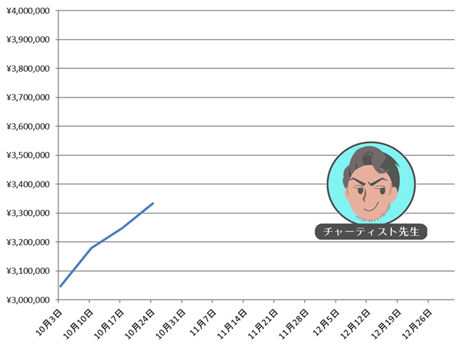 期間 累計実現損益 10月1日~10月2日 +46,531円 10月3日~10月9日 +132,202円 10月10日~10月16日 +70,560円 10月17日~10月23日 +84,240円 10月24日~10月30日 +70,069円