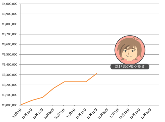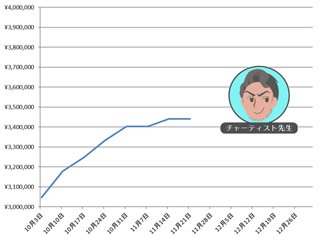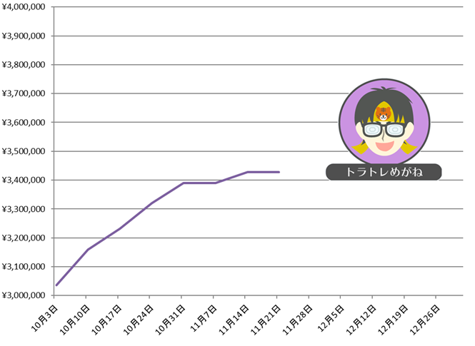 期間 累計実現損益 10月1日~10月2日 +46,531円 10月3日~10月9日 +132,202円 10月10日~10月16日 +70,560円 10月17日~10月23日 +84,240円 10月24日~10月30日 +70,069円 10月31日~11月6日 +0円 11月7日~11月13日 +36,517円 11月14日~11月20日 ±0円