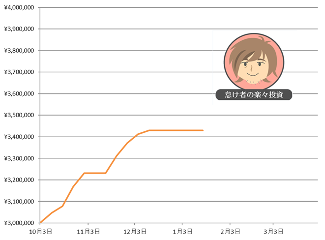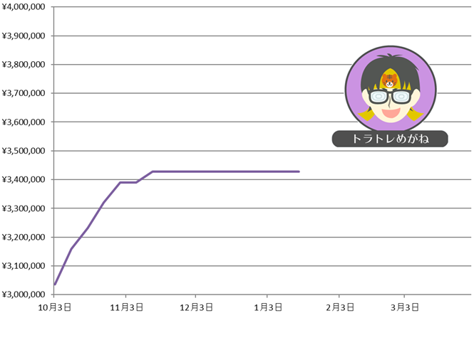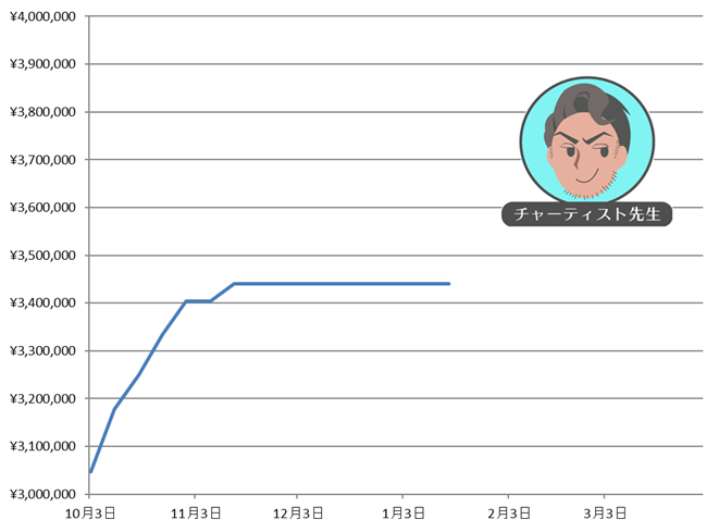 期間 累計実現損益 10月1日~10月2日 +46,531円 10月3日~10月9日 +132,202円 10月10日~10月16日 +70,560円 10月17日~10月23日 +84,240円 10月24日~10月30日 +70,069円 10月31日~11月6日 +0円 11月7日~11月13日 +36,517円 11月14日~11月20日 ±0円 11月21日~11月27日 ±0円 11月28日~12月4日 ±0円 12月5日~12月11日 ±0円 12月12日~12月18日 ±0円 12月19日~12月25日 ±0円 12月26日~1月1日 ±0円 1月2日~1月8日 ±0円 1月9日~1月15日 ±0円