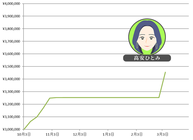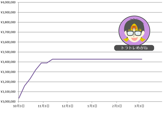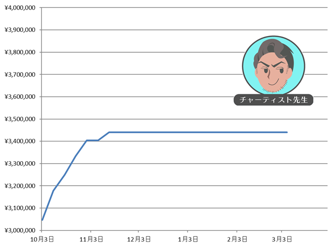期間 累計実現損益 10月1日~10月2日 +46,531円 10月3日~10月9日 +132,202円 10月10日~10月16日 +70,560円 10月17日~10月23日 +84,240円 10月24日~10月30日 +70,069円 10月31日~11月6日 +0円 11月7日~11月13日 +36,517円 11月14日~11月20日 ±0円 11月21日~11月27日 ±0円 11月28日~12月4日 ±0円 12月5日~12月11日 ±0円 12月12日~12月18日 ±0円 12月19日~12月25日 ±0円 12月26日~1月1日 ±0円 1月2日~1月8日 ±0円 1月9日~1月15日 ±0円 1月16日~1月22日 ±0円 1月23日~1月29日 ±0円 1月30日~2月5日 ±0円 2月6日~2月12日 ±0円 2月13日~2月19日 ±0円 2月20日~2月26日 ±0円 2月27日~3月5日 ±0円