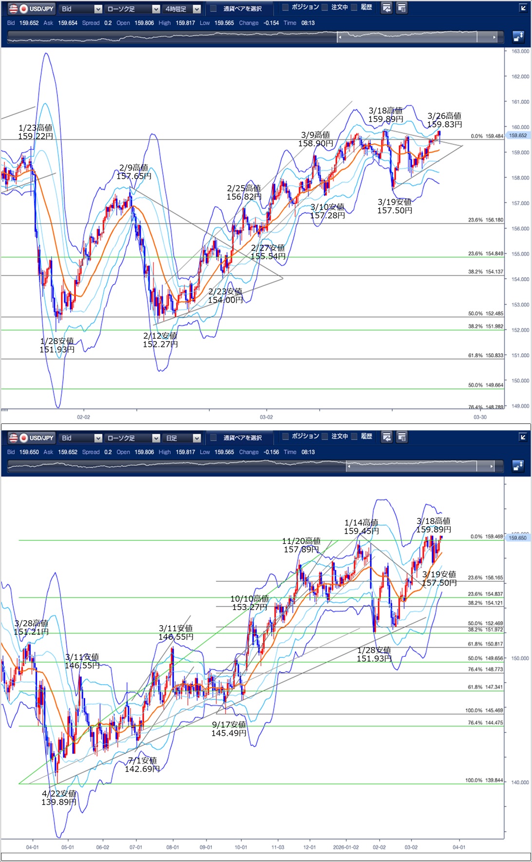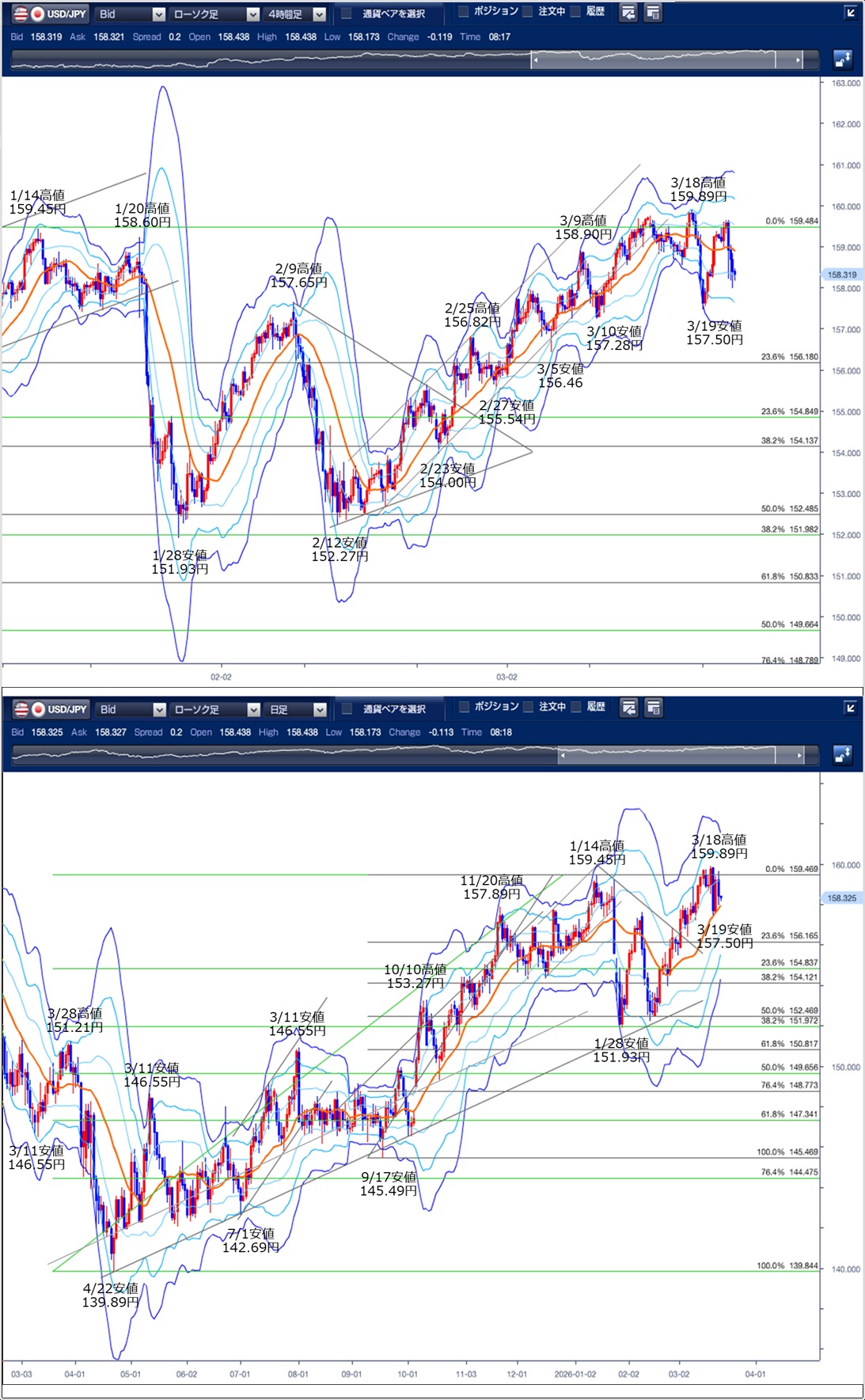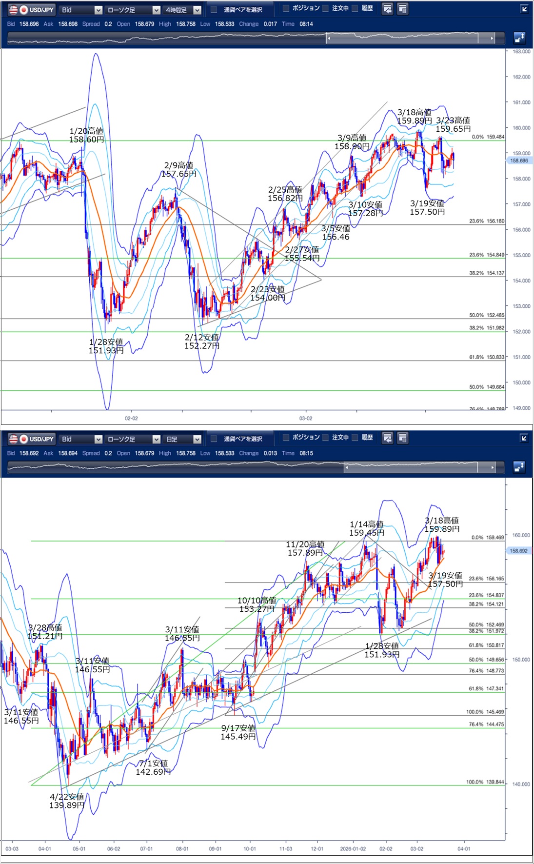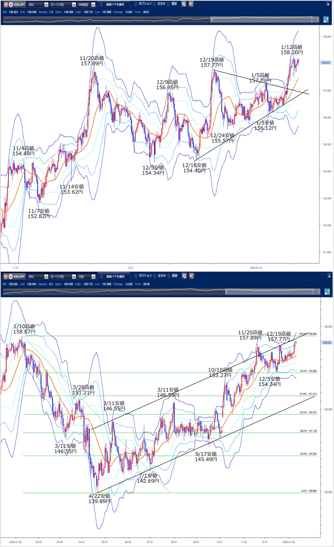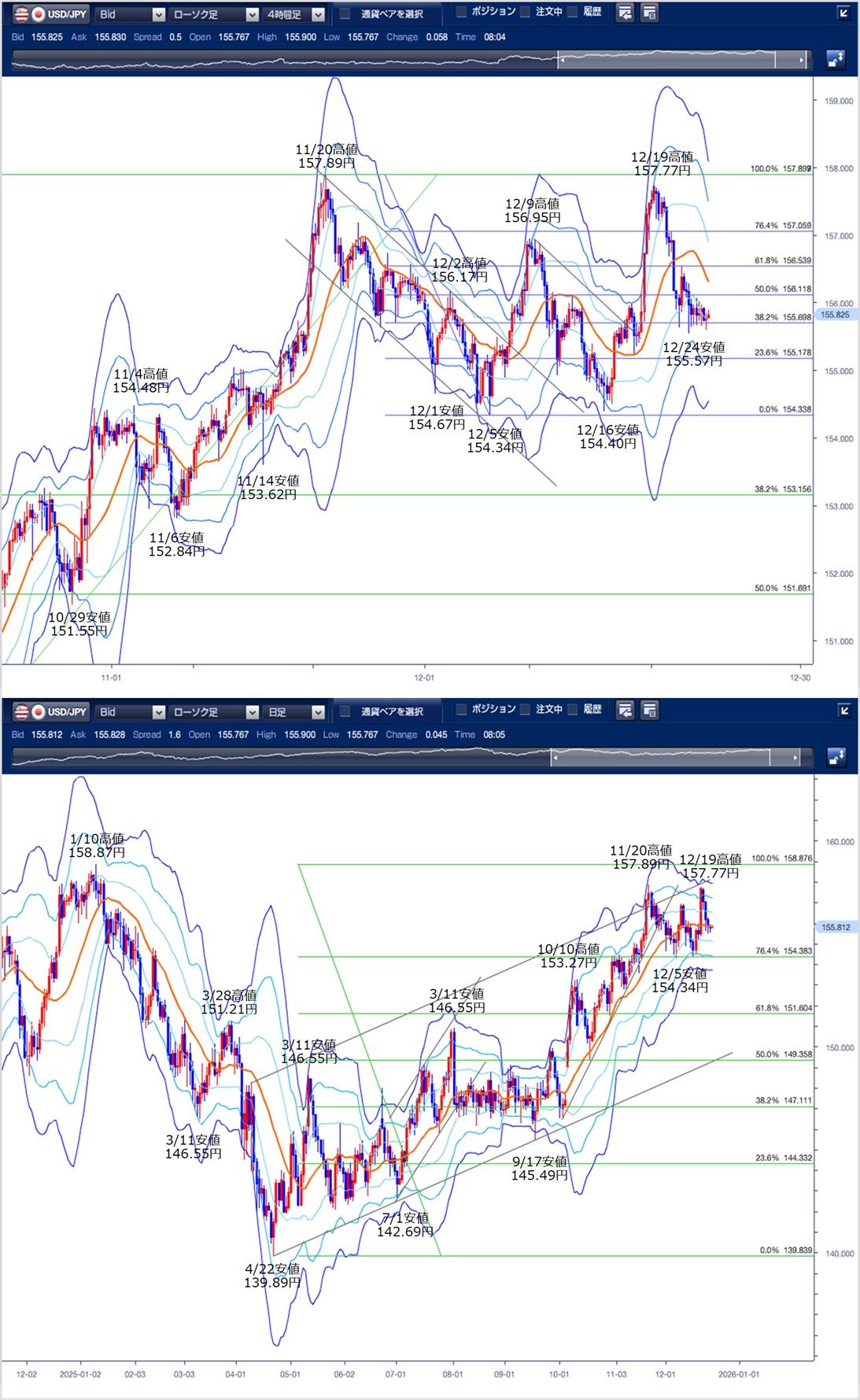 ドル円の前日の為替相場の動きを、各テクニカルで検証します。