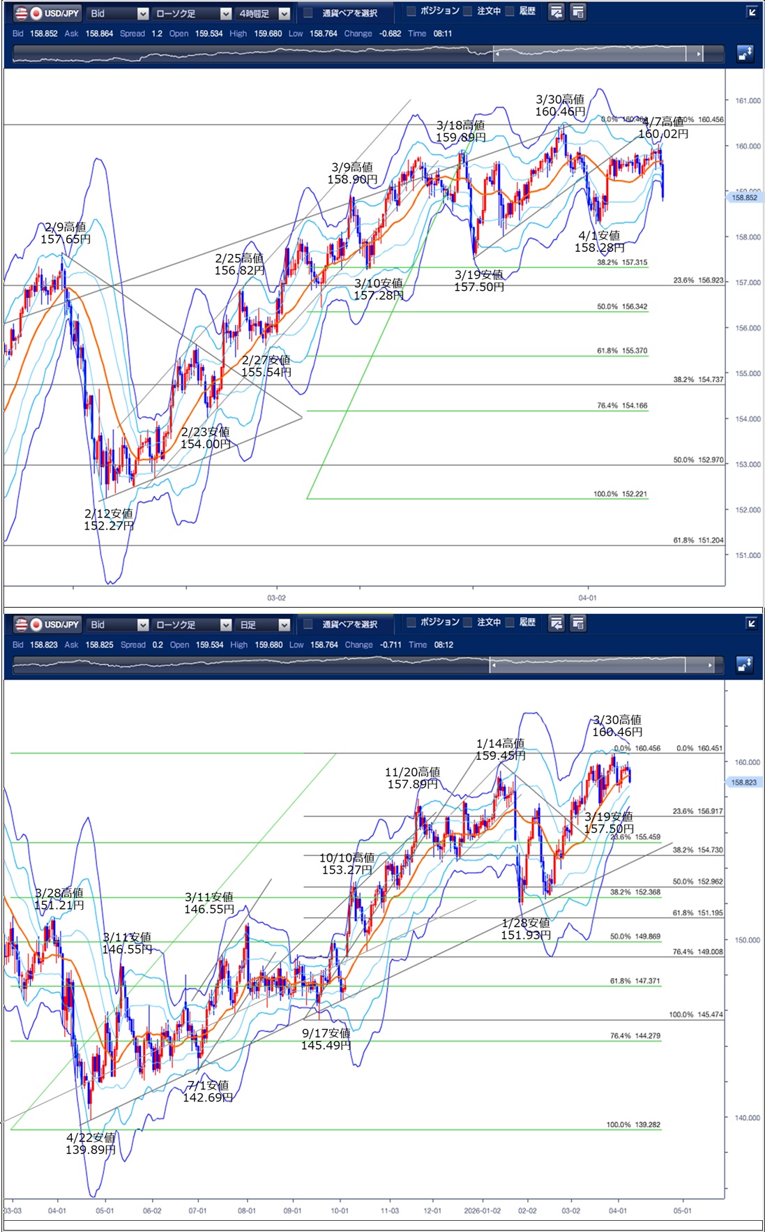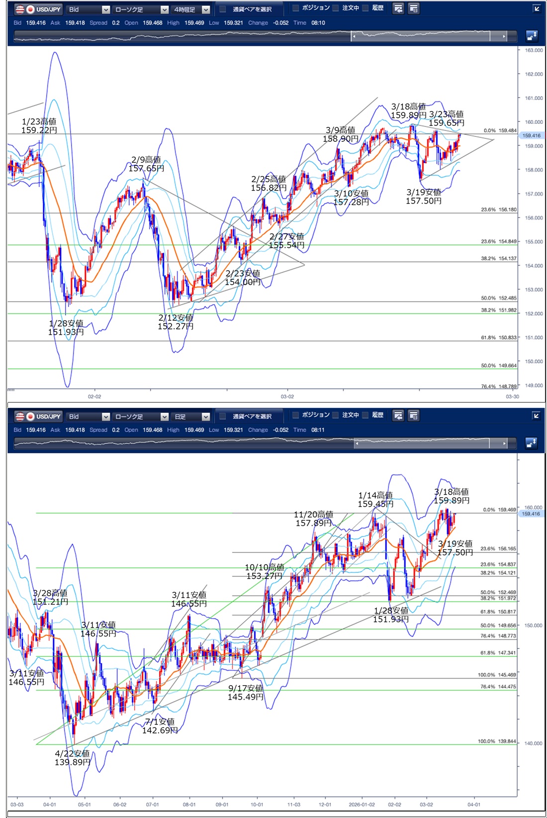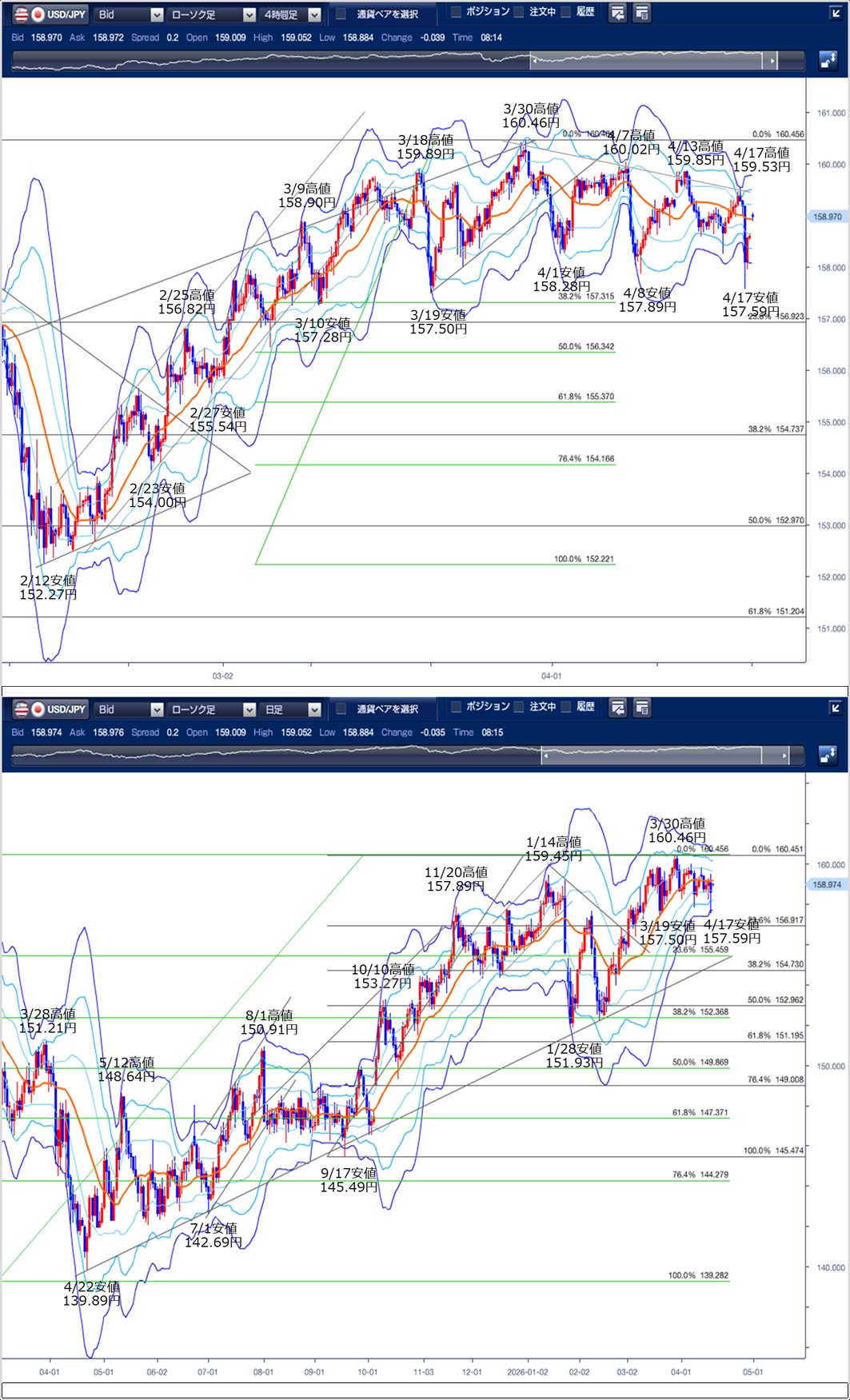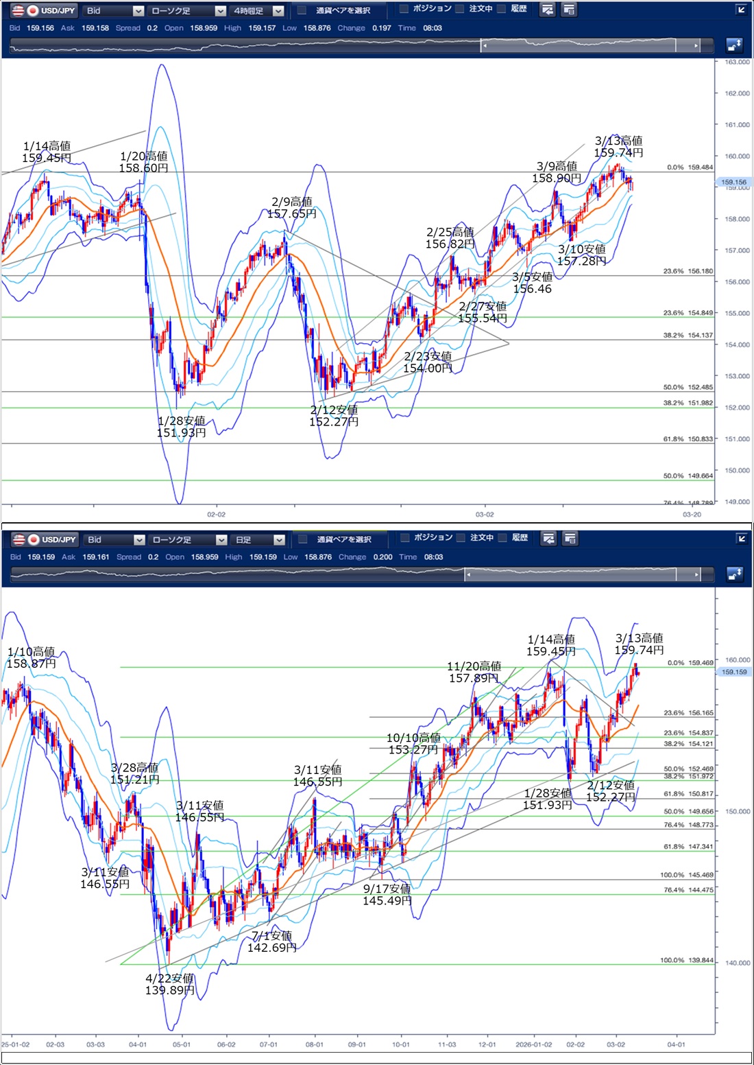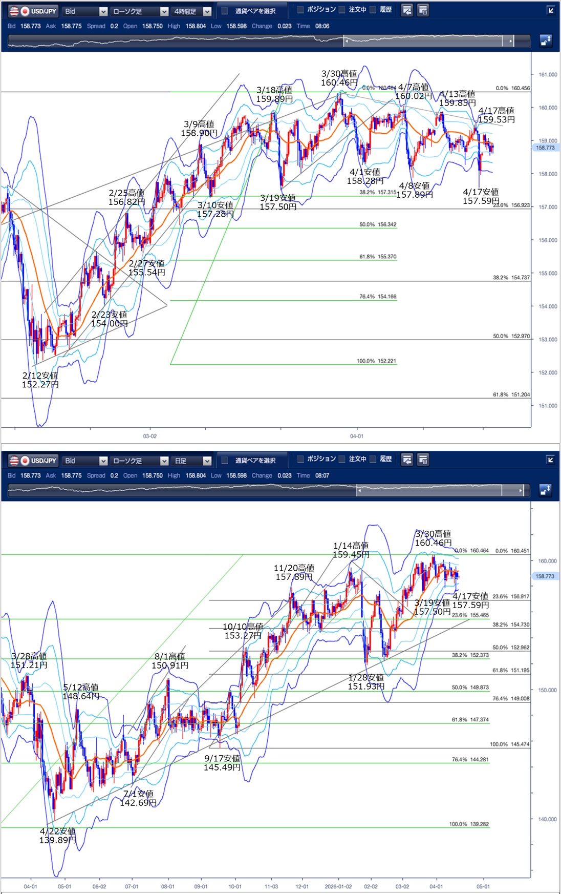 ドル円の前日の為替相場の動きを、各テクニカルで検証します。