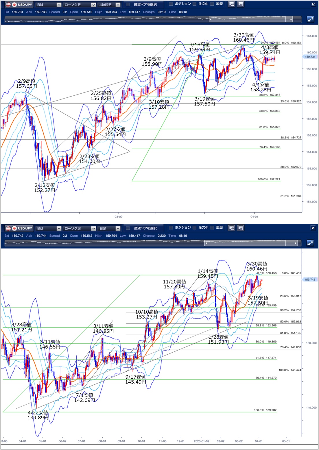 昨日(4月6日)のドル円は、4日続伸。 中東紛争の長期化懸念の高まりを受けた有事のドル買いが優勢となり、159.83円まで上昇しました。 東京市場は上昇後に反落。 朝方に159.42円まで下落したものの、「米国が仲介国を通じてイランに48時間の停戦を提案したことに対して、イランは停戦を拒否し、激しい攻撃で回答」との一部報道が伝わると有事のドル買いが優勢となり、159.83円まで上昇しました。その後、「米国とイラン、および仲裁役が45日間の停戦案について協議している」との一部報道が伝わると、有事のドル買いの巻き戻しから159.53円まで反落しました。 欧州市場は下値が堅い。 「イランと米国は、仲裁国パキスタンがまとめた、停戦・最終合意の2段階紛争終結案を受領」との一部報道を受け、159.29円まで下落したものの、下落傾向だった原油価格が上昇に転じたことを背景にドル買戻しが優勢となり、159.58円まで値を戻しました。 NY市場は上値が重い。 イランはパキスタンを通じ、停戦案を受け入れないとの回答を米国側に示したことが伝わると、中東紛争の長期化懸念の高まりを受け、159.80円まで上昇しました。ただ、東京高値159.83円が意識されると買いも続かず、159.59円まで下落する展開となりました。 ========================
