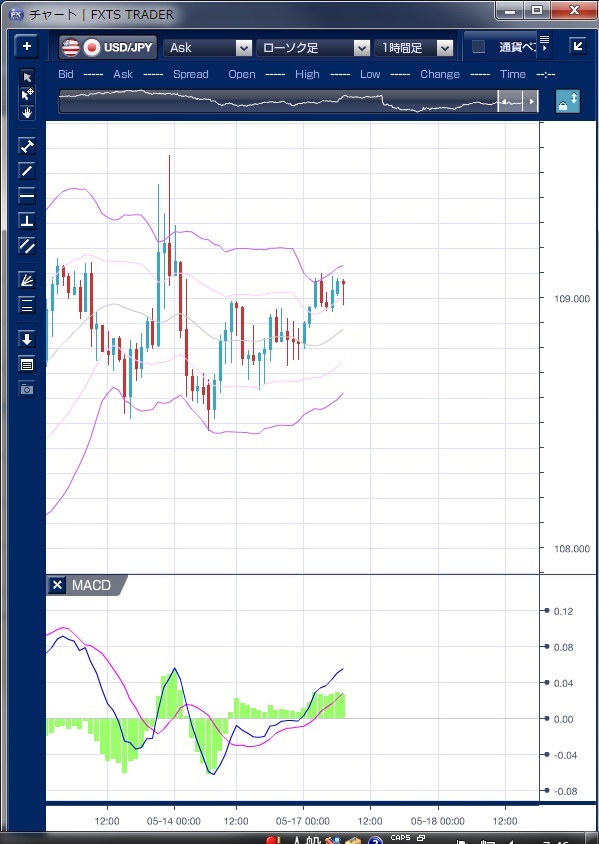 昨日のドル/円相場は、東京朝方は米株安となった前週末の海外時間のリスクオフの流れを受け、108円46銭まで下押ししましたが、日経平均株価がプラスに転じて上げ幅を広げると、ドル/円もジリジリと値を戻す動きとなりました。 もっとも、売買の主体は投機筋が中心で取引自体はそれほど膨らんでいないとの指摘も聞かれました。 海外時間に入っても、ドルの底堅さは続き、6ヶ月ぶりの高値を更新した原油相場や株価の上昇を好感したリスク選好の動きが強まり、109円台を回復してほぼ高値水準でNYを引けています。 テクニカルで見ると、ボリンジャーバンドは横ばいで、相場はバンドの中での動きにとどまっているため、強い勢いは感じない形といえます。 しかし、目先では昨日の東京時間の上昇でMACDが買い転換しており、その後も一貫して買いサインが続いていることから、ドルの底堅さが示唆されています。 本日もドルの堅調な地合は続くと思われるものの、一気に110円を突破するほどの勢いはないものと考えられます。 110円近辺からは本邦輸出企業のドル売り意欲が強まるものとの指摘もあり、安易に上値追いはまだリスクが高いように思われます。 ※チャートは、ドル/円の1時間足ボリンジャーバンドMACDを表示しています。