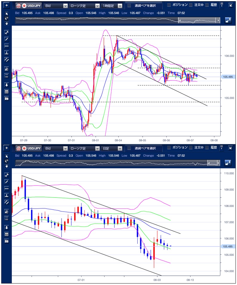 昨日(8月6日)のドル円相場は、本日(7日)の米雇用統計を控えて様子見ムードが強く、105.30〜105.69円と39銭の値幅で動意薄となりました。 東京市場のドル円は、105.38〜105.61円と23銭の狭いレンジで推移しました。 欧州勢が参入後105.69円まで上昇し、一時日通し高値をつけものの、その後は利食いのドル売りからじり安の展開となりました。 NY勢参入後はもみ合い。23時頃には日通し安値となる105.30円を付けたものの、105円台前半ではドル買い意欲も強く、105.64円まで反発しました。 その後は、米雇用統計の発表を控えた様子見ムードが強く、方向感が出にくいなか105.54円でNYをクローズしました。 テクニカル(ドル円1時間足チャート)でみると、引き続きスクイーズとなっており、もみ合いを示唆しています。 本日は21時30分に米雇用統計があり、それまでは様子見ムードになると考えております。 上値目途は8月6日高値105.69円で抜けた場合には8月3日高値106.47円、下値目途は8月6日安値105.30円、抜けた場合には8月3日を起点としたレジスタンスラインのチャネルラインが位置する104.90円台をみています。 ※チャートは、ドル/円の一時間足ボリンジャーバンドを表示しています。