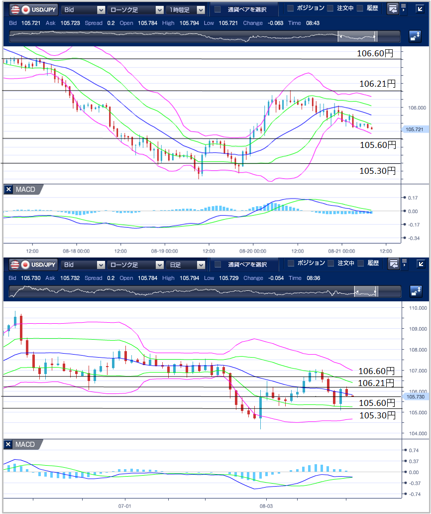昨日(8月20日)のドル円相場は、反落。106円台の上値が重く、じり安となり、105.74円(27時台安値)〜106.21円(10時台高値)と47銭の値幅で推移しました。 東京市場は、動意に乏しく、105.98円〜106.21円(23銭幅)と狭いレンジでの値動きとなりました。 欧州時間に入り、じり安の展開となりました。 NY時間参入後に、米新規失業保険申請件数(結果110.6万件、予想92.5万件)が市場予想より悪い結果となったことで、105.77円まで急落したものの、105.70円台で、利食いの買い戻しやまとまった買いが入り106.05円まで急反発しました。しかし、106円では売り圧力が強く、再びドル売り優勢となり、その後105.75円まで下落し、日通し安値を付けました。 テクニカル(ドル円1時間足チャート)では、ボリンジャーバンド全体が緩やかな右肩下がりとなっており、じり安の形状となっております。 しかしながら、105.30円〜105.60円に複数の抵抗帯があるため、下げ止まるのではないかと考えています。 以上のことから、本日は、押し目買い優勢の展開と考えます。 下値①:105.60円(8/19東京時間高値) 下値②:105.30円(8/5安値、8/6安値、8/18安値) 上値①:106.21円(8/20高値) 上値②:106.60円(8/13安値近辺) なお、105.30円近辺を下回った場合は、急落する可能性が高いため注視したい。 ※チャートは、ドル/円の一時間足ボリンジャーバンドを表示しています。