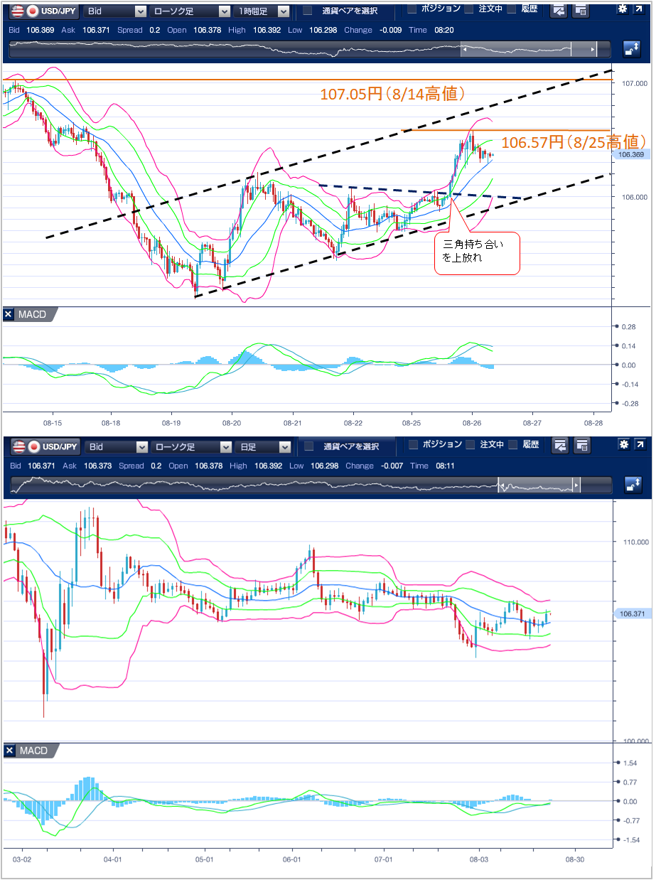 また、昨日記載したように、8/20高値の106.21円を起点としたレジスタンスラインと、8/19安値の105.10を起点としたサポートラインが形成していた三角持ち合いを上抜けたことで、106.57円まで続伸しましたが、7月中に形成された106.60円付近の抵抗帯が上値を抑える形となっています。