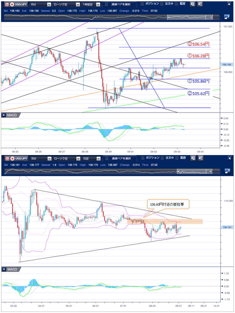 昨日(9月2日)のドル円相場は、3日続伸。対欧州通貨でのドル買いがドル円に波及し、前日の高値106.15円を上抜けて、一時106.30円まで上値を伸ばしました。 ドル円は下値が堅い。105.94円で寄り付いた後、9時前に105.84円まで下落する場面があったものの、その後はユーロドルの下落によるドルの買い戻しが入ったことで、106.12円まで上昇。一巡後も106円台で底堅く推移しました。 欧州市場は、上昇。前日からのドルの買戻しの流れが継続し、105.96円から106.16円まで上昇しました。 NY市場は、3日続伸。ダウ平均が一時510ドル超上昇し、約半年ぶりの高値を更新すると106.30円まで上昇する場面もありましたが、21時15分に発表された、米8月ADP雇用統計(予想95.0万人 結果42.8万人)の弱い結果を受けて、ドル売り・円買いが優勢となり、106.10円まで下落。小幅に持ち直して106.17円でNYをクローズしています。 テクニカル(ドル円1時間足チャート)では、8/28高値の106.95円から同日安値の105.20円において、安値からの61.8%戻しの106.30円付近で頭を押さえられており、ドルの上値は限定的となっています。また、下値も50.0%戻しの106.08円付近では底堅く推移しています。 以上のことから、本日の上値のめどは、61.8%戻しとなる106.28円が第1ターゲット、76.4%戻しとなる106.54円が第2ターゲットと予想します。ただし、上値では106.60円付近(7/10安値、7/15安値、7/18安値、7/19安値)に抵抗帯が存在しているため、このレベルを上抜けることができるかに注目です。 また、下値では106.95円から105.20円の38.2%戻しにあたる105.86円、23.6%戻しにあたる105.62円が下値めどと予想します。 そこを割り込むと次のターゲットは105.20円(8/28安値)と予想します。ただし、105.20円を下回った場合は、急落する可能性が高いため注視したい。 ※チャートは、ドル/円の一時間足ボリンジャーバンドを表示しています。