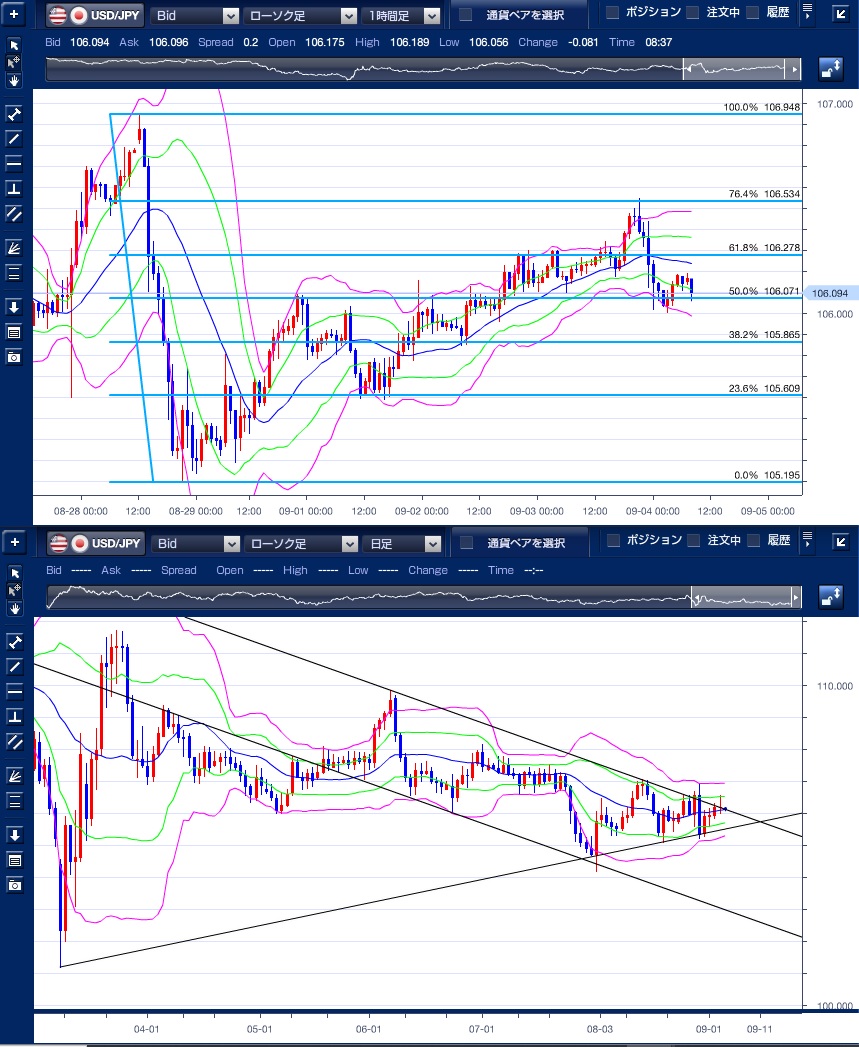 昨日(9月3日)のドル円相場は、一時106.54円と8月28日以来、約1週間ぶりの高値を記録したものの、NYダウが一時1,000ドル近く暴落したことを受け、106.00円まで急反落しました。 東京市場ではじり高に推移。日経平均株価が堅調に推移したことでドル買い優勢となり、昨日高値の106.30円を上抜けて一時106.34円まで上昇しました。 欧州市場でもドル買いは継続し、NY勢が参入する21時過ぎには106.54円と8月28日以来の高値をつけました。 しかし、23時に発表された米ISM製造業景況指数が56.9と予想57.0を下回ると、NYダウが940ドル超下落し、リスク回避からドル売り優勢となったことで106.00円まで急反落しました。 その後、NY市場後半では本日発表予定の米雇用統計を控えて様子見が強まり、106.18円でNYをクローズしました。 テクニカル(ドル円1時間足チャート)でみると、8月28日高値の106.95円から同日安値の105.20円において、安値からの76.4%戻しである106.50円付近で上値を押さえられていたことが分かります。 本日は21時半に米雇用統計が発表されるため、発表時間までは様子見の動きが強まると予想します。 上値目途は、76.4%戻しで昨日の高値となる106.54円が第1ターゲット、第2ターゲットは107.00円付近(8/12高値、8/13高値、8/14高値、8/28高値)と考えます。 また、下値目途は106.95円から105.20円の38.2%戻しにあたる105.86円、23.6%戻しにあたる105.60円をみています。 ※チャートは、ドル/円の一時間足ボリンジャーバンドを表示しています。