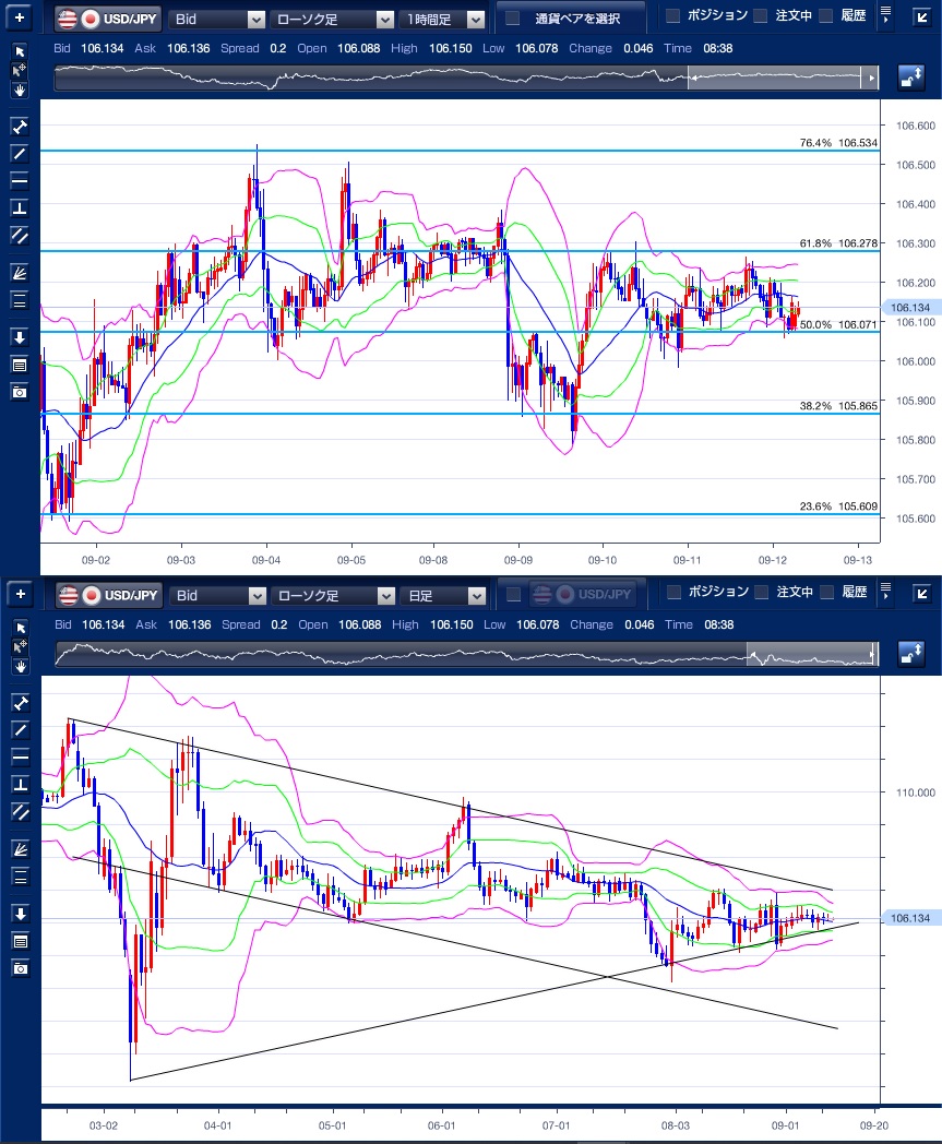 先週末(9月11日)のドル円相場は、市場の注目がポンドやユーロに向かっているため、方向感を見出せず、106.05〜106.26円と21銭の狭いレンジでほぼ横ばいに推移しました。 東京市場では106.07〜106.21円で動意に乏しく推移しました。 海外勢が参入後、21時30分に発表された8月米消費者物価指数(CPI)が予想を上回ったものの、ドル買いは継続せず、106.14円でNYをクローズしました。 市場では、今週開催されるFOMC(米連邦公開市場委員会)や日銀金融政策決定会合など、重要なイベントを控えているため、方向感が出にくかったとの指摘があります。 テクニカル(ドル円1時間足チャート)でみると、ボリンジャーバンドが横這いとなっており、相場に方向性がないことを示唆しています。 以上のことから、本日は明日から開催されるFOMCの結果を見極めたいとの思惑から、様子見ムードが強まると予想します。 上値目途は8月28日安値から76.4%戻しとなる106.53円が第1ターゲット、上抜けた場合には8月28日高値の106.94円を第2ターゲット、下値目途は9月9日安値となる105.78円付近と考えます。 ※チャートは、ドル/円の一時間足ボリンジャーバンドを表示しています。