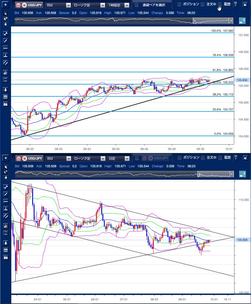 昨日(9月29日)のドル円相場は、105.34〜105.73円と39銭の値幅で動意に乏しく推移しました。 東京市場では、月末に絡んだ本邦輸出企業による実需のドル売りから一時105.34円まで値を下げたものの、前日安値105.26円を前に下げ渋ると徐々に値を切り上げました。 欧州勢が参入後もドル買いは継続し、18時前には105.73円と日通し高値をつけました。 もっとも、本日(9月30日)、日本時間午前10時に予定されている米大統領候補のテレビ討論会を前に様子見ムードも根強く、その後は狭いレンジでの推移となり、NY市場では105.57〜105.70円と僅か13銭の値幅で方向感なく推移しました。 テクニカル(ドル円1時間足チャート)でみると、ボリンジャーバンドの中心線は右肩上がりでドル買い優勢を示しているものの、±2σがスクイーズの形状となっており、相場に方向感がないことがわかります。 上値目途は、8/13の高値(107.05)から61.8%戻しとなる105.88円を第1ターゲット、上抜けた場合には76.4%戻しとなる106.33円を第2ターゲットと予想しており、下値目途は38.2%戻しとなる105.17円を第1ターゲット、下抜けた場合には23.6%戻しとなる104.72円を第2ターゲットと考えます。 本日の注目材料としては、日本時間午前10時頃の行われる、第1回大統領候補討論会、また、NYタイムでは21時15分に米ADP雇用統計、21時半には第2四半期GDP(確報値)など、重要指標の発表も予定されています。 ※チャートは、ドル/円の一時間足ボリンジャーバンドを表示しています。
