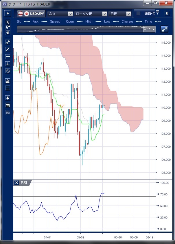 先週のドル/円相場は、4月FOMC議事要旨がマーケットの予想よりもタカ派的であったことを受けて110円を突破するなど、全般的にドルが底堅く推移しました。 麻生財務相が週末の仙台G7の初日会合後に会見し、「為替市場において過度の変動は経済に悪影響を与えるが、為替の競争的切り下げ回避にコミットしていると会議で発言した」と表明したものの「会合では為替の最近の動きについて議論なかった」とG7での為替相場への言及が限られたこともドルを支える要因となったとの指摘もあります。 テクニカルで見ても、先週は一目均衡表で転換線が基準線を上回り、また、遅行スパンも買い転換するなど、ドルの底打ちの可能性を示唆する形となっています。 ただし、現状上値は、先行スパンの雲に抑えられており、110円台は本邦輸出企業のドル売り意欲が強まる水準であるため、一気に上抜けすることは難しいかもしれません。 また、RSIが高値水準にあり、これもドルの上値を抑える要因となりそうです。 今週は、米国ではFRBイエレン議長の講演が予定されており、4月FOMC議事要旨と同じように利上げ再開に前向きな姿勢を示すかが注目されます。 また、週末にはG7首脳会合(伊勢志摩サミット)が予定されており、財政出動や消費増税先送りなど市場の期待が高まった場合には、結果のよって大きく振り回されるサプライズリスクがあることには留意が必要でしょう。 ※チャートは、ドル/円の日足一目均衡表RSIを表示しています。