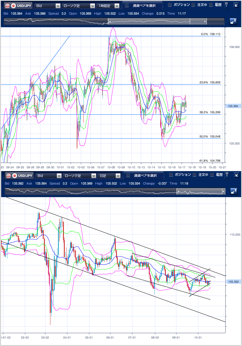 先週末(10月16日)のドル円相場は、105.19円〜105.44円の25銭幅で方向感なく推移しました。 東京市場は、下落。朝方105.44円の高値を付けてから、クロス円の売りに伴う円買いが優勢となり、105.19円まで値を下げました。 欧州市場は、動意に乏しく、105.19円〜105.34円の15銭幅での推移となりました。 NY市場は、上昇。発表された9月米小売売上高や10月ミシガン大学消費者態度指数・速報値など良好な結果が続いたことから、ドル買いが優勢となり、24時過ぎに105.44円まで上昇しましたが、東京時間高値の105.44円が意識されると、105.34円まで下げてNYをクローズしています。 テクニカル(ドル円1時間足チャート)でみると、ボリンジャーバンドは、横ばいから上昇に転じております。9/21の安値104円から10/7、10/8の高値である106.10の50%戻しとなる105.05円が意識され、下げ渋る展開となっています。 日足チャートで見ると、ダウントレンドを継続しておりますが、9/21の安値104円から10/15の安値105.05円を結んだサポートラインが機能し、上昇に転じています。 以上のことから、本日の下値目途は、50%戻しとなる105.05円とし、下抜けた場合は、61.8%戻しとなる104.80円が視野に入ります。上値目途は、23.6%戻しとなる105.60円となり、上抜けると106.11円がターゲットとなります。 ※チャートは、ドル/円の一時間足ボリンジャーバンドを表示しています。