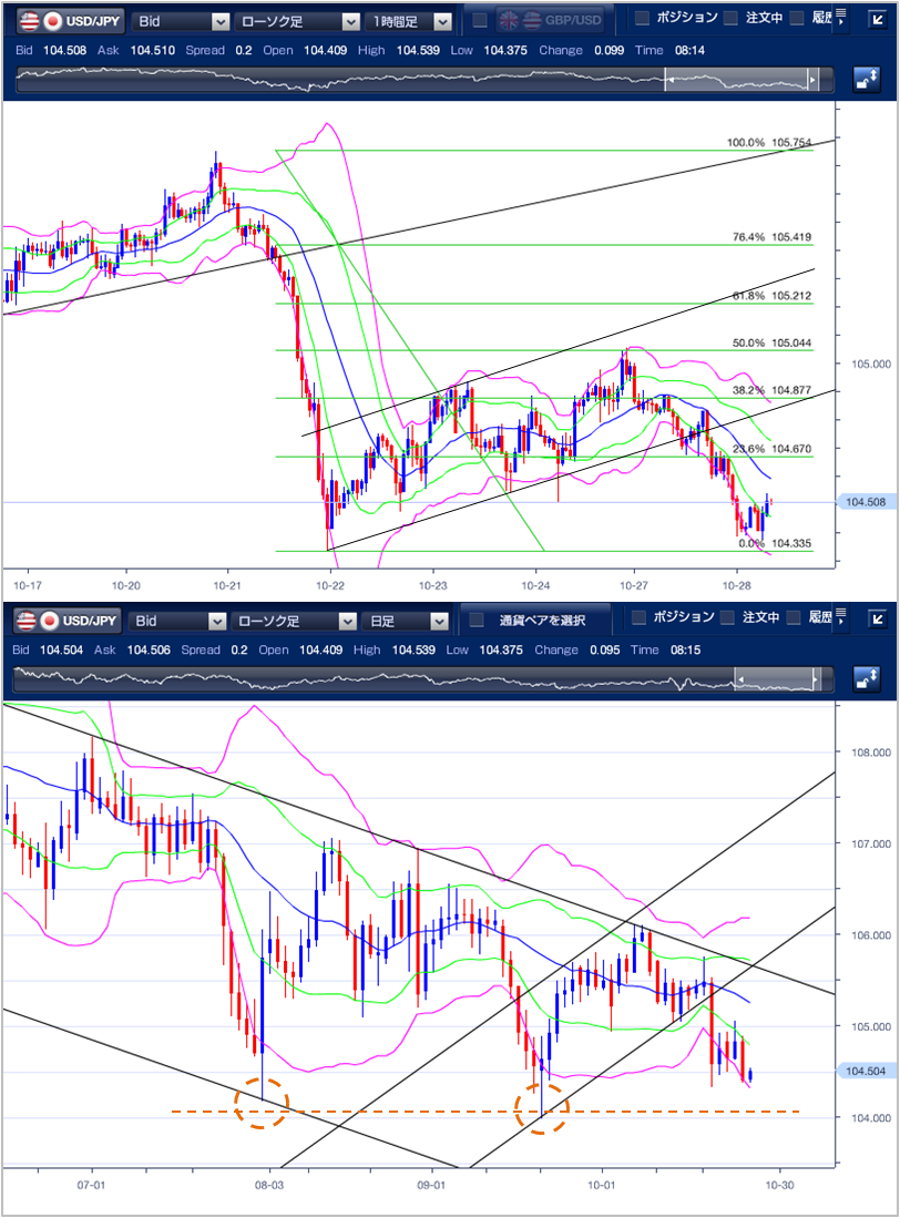 昨日(10月27日)のドル円相場は、リスク回避的な円買い・ドル売りが優勢となり、104.38円まで下落する展開となりました。 東京市場は下落。朝方104.88円まで上昇する場面もありましたが、昨日の海外時間に105円台での上値の重さを確認したこともあり、ドル安・円高の流れは継続し、104.67円まで下落しました。 欧州市場は、軟調。欧州勢参入直後に一時104.83円まで持ち直す場面もありましたが、東京市場の高値104.88円が意識され、上値を伸ばすことができず、104.59円まで失速する展開となりました。 NY市場は、反落。米国株の下落を背景にリスク回避的な円買い・ドル売りが優勢となり、一時104.38円と日通し安値を付けました。ただ、21日の安値104.34円がサポートとして意識されると下げ渋り、104.40円でNYをクローズしています。 テクニカル(ドル円1時間足チャート)でみると、ボリンジャーバンドは、右肩下がりとなっており、下落を示唆しています。また、10/20高値の105.75円からの38.2%戻しとなる104.87円近辺で上値を抑えられて反落しておりますので、上値の重い展開が予想されます。 日足チャートで見ると、ダウントレンドを継続しており、8/19、8/28の安値105.10円を割り込んだことで、大きく下落しています。 日足では7/31安値の104.18円、また9/21安値の104.00円が次のサポートラインとして意識されている展開です。 以上のことから、本日の下値目途は、10/21安値の104.34円、下抜けると9/21安値の104.00円が視野に入ります。上値目途は、10/21安値の104.34円の50%戻しとなる105.04円、上抜けた場合は、38.2%戻しとなる105.21円がターゲットとみています。なお、下値104.00円を下抜けた場合は、急落する可能性が高いため注視したい。 ※チャートは、ドル/円の一時間足ボリンジャーバンドを表示しています。