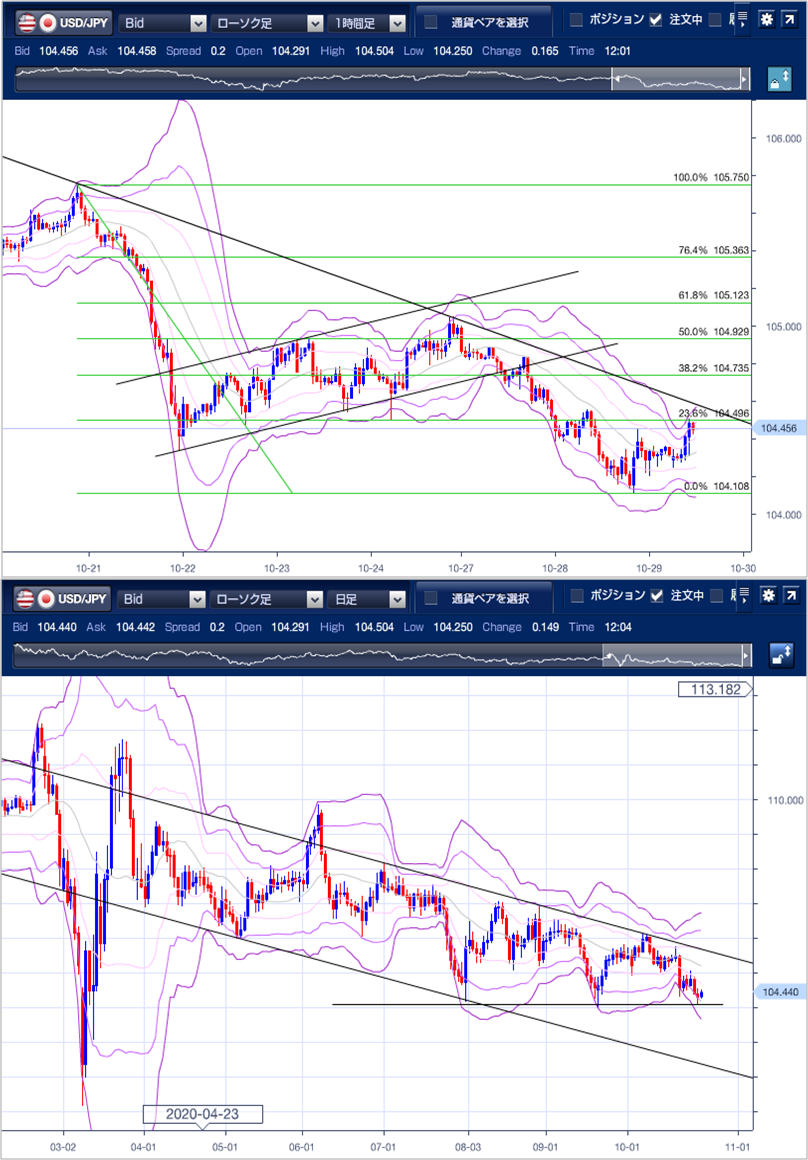 ◆リスク回避の円買いで上値の重い展開 昨日(10月28日)のドル円相場は、リスク回避の円買いで上値の重い展開が続き、104.11円まで下落する展開となりました。 東京市場は下落。朝方に104.55円まで上昇する場面もありましたが、月末ということもあり国内輸出企業からのドル売りに押され、104.20円まで下落しました。 欧州市場は、方向感なく推移。欧州株相場の下落を背景にリスク回避の円買いが先行すると、104.11円まで下落しましたが、9月21日の安値104.00円がサポートとして意識されると買い戻しが優勢となり、104.45円付近まで持ち直しました。 NY市場は、もみ合い。米大統領選を来週に控えて動意に乏しく、104.30円を挟んだもみ合いとなりました。引けにかけて小反発するも戻りは鈍く、104.31円でNYをクローズしています。 テクニカル(ドル円1時間足チャート)でみると、ボリンジャーバンドは、右肩下がりとなっており、下落を示唆しています。昨日のレポートの下値目途であった10月21日安値の104.34円を割り込んで、9/21安値の104.00円がサポートとして機能しております。 また、10/20高値の105.75円からの76.4%戻しとなる104.49円近辺で上値を抑えられて反落しておりますので、上値の重い展開が予想されます。 日足チャートで見ると、ダウントレンドを継続しており、8/19、8/28の安値105.10円を割り込んだことで、大きく下落していますが、9/21安値の104.00円がサポートラインとして意識されている展開です。 以上のことから、本日の下値目途は、9/21安値の104.00円、上値目途は、10/21安値の104.34円の23.6%戻しとなる104.67円、上抜けた場合は、38.2%戻しとなる104.87円がターゲットとみています。なお、下値104.00円を下抜けた場合は、急落する可能性が高いため注視したい。 ※チャートは、ドル/円の一時間足ボリンジャーバンドを表示しています。