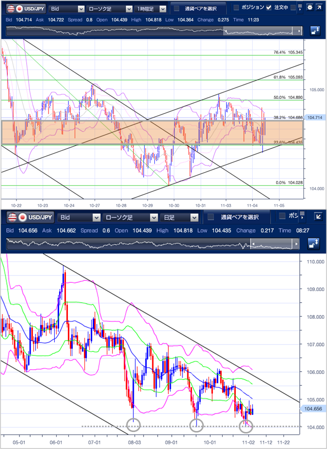 ◆米国大統領選挙を前に方向感に欠ける展開 ============================== 昨日(11月3日)のドル円相場は、米国大統領選挙を前に方向感に欠ける展開で、104円半ばでのもみ合いに終始しました。 東京市場は、祝日ということもあり、104.63円〜104.81円の18銭幅で動意に薄い展開となりました。 欧州市場は、米国大統領選挙を前にしたポジション調整の動きで104.47円まで下げる場面もありましたが、欧州株価が堅調に推移すると、ユーロやポンドに対して円売りが優勢となり、104.80円まで戻す展開となりました。 NY市場は、頭の重い展開。大統領選挙も目前に控え、ドル売りの流れが優勢となり、24時過ぎに104.43円と日通し安値を更新しました。その後は、動意に乏しく、104円半ばでのもみ合いとなり、104.45円でNYをクローズしています。 テクニカル(ドル円1時間足チャート)でみると、ボリンジャーバンドは下向きに転じており、下落を示唆しています。ただし、10/20高値105.75円と10/29安値の104.02円の23.6%戻しとなる104.43円付近では、下げ渋る展開となっています。 日足チャートで見ると、ダウントレンドを継続しており、8/19、8/28の安値105.10円を割り込んだことで、大きく下落していますが、9/21安値の104.00円がサポートラインとして意識されている展開です。また、上値も105円付近の抵抗帯があり、方向感が出にくい状況が続いています。 以上のことから、本日の下値目途は、9/21安値の104.00円、10/29安値の104.02円。上値目途は、10/20高値105.75円と10/29安値の104.02円の50%戻しとなる104.88円、上抜けた場合は、61.8%戻しとなる105.09円がターゲットとみています。 なお、下値104.00円を下抜けた場合は、急落する可能性が高いため注視したい。 ※チャートは、ドル/円の一時間足ボリンジャーバンドを表示しています。