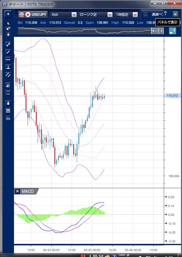 昨日のドル/円相場は、東京時間では手がかりに乏しく、109円前半でのもみ合いが続いて方向感は出ませんでした。 約1週間ぶりの安値圏となる109円前半では、ドルを買い遅れた輸入企業の一部からの買いが入って相場の支えになったものの、この水準付近での実需のドル買いは一巡したとの指摘もありました。 欧州時間に入ると、堅調な株価を眺めながら徐々にドルが変われる動きとなり、さらにNY時間では連邦準備制度理事会(FRB)高官が年2、3回の利上げの可能性に言及したこと、4月新築住宅販売件数が市場予想を上回り8年ぶりの高水準に達したことを受けて、早期利上げ観測に伴うドル買いが強まり、一時110円13銭まで上昇しました。 この上昇で、ボリンジャーバンドの上抜けと、バンドウォークが発生していることが確認できます。 もっとも、MACDは前日のNY引けにかけて既に買い転換しており、昨日のドル上昇を示唆していたことがわかります。 本日は、先週非常の重かった110円台を売りをこなしながら上昇することが出来るかどうかを見極める必要がありそうです。 ※チャートは、ドル/円の1時間足ボリンジャーバンドMACDを表示しています。