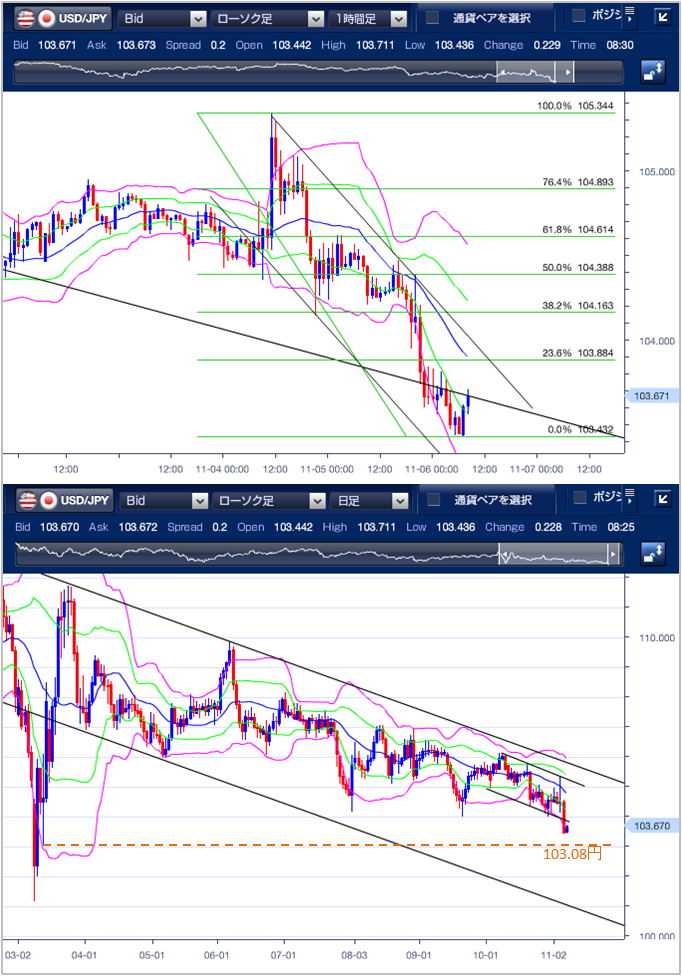 昨日(11月5日)のドル円相場は、米大統領選の結果が近く判明するとの見方から、米政治の不透明感が後退し、リスク選好のドル売りが優勢となり、3/12以来、約8ヵ月ぶり安値となる103.44円まで急落しました。