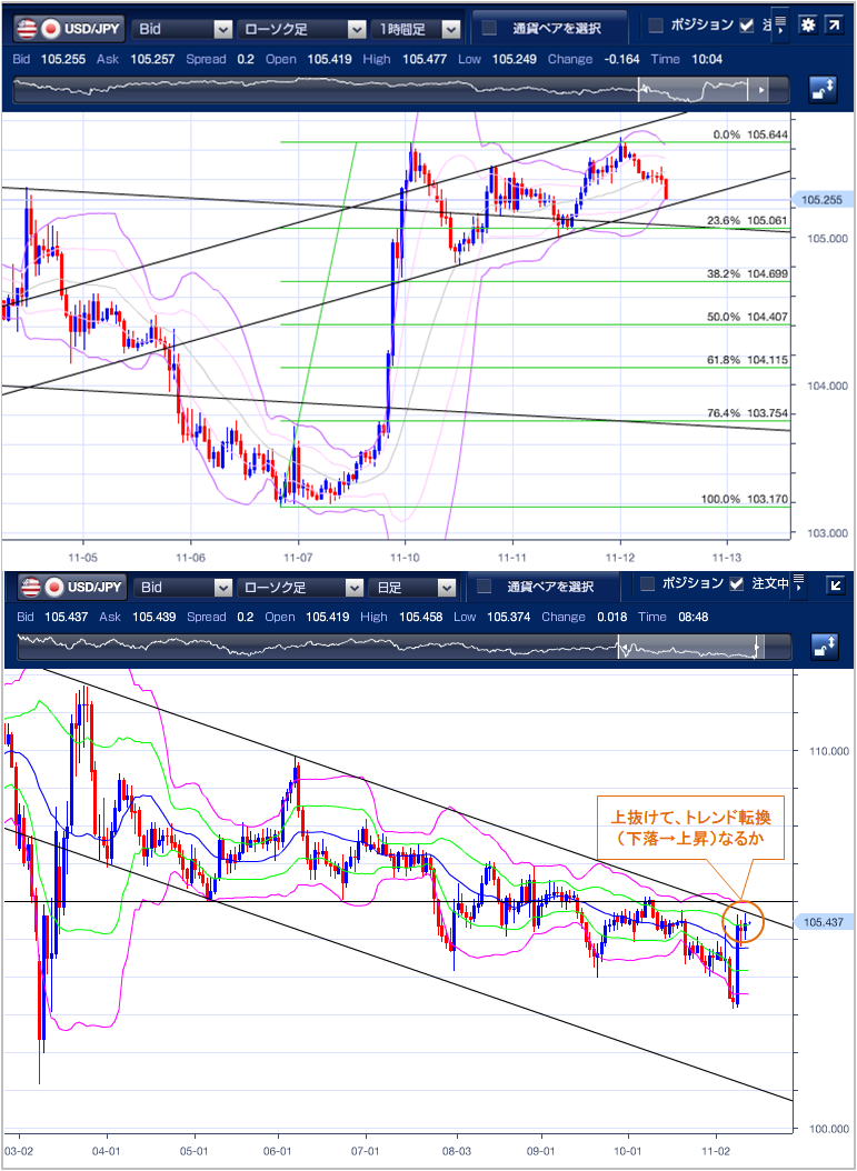 ◆10/20以来となる高値105.68円まで上昇 ==================== 昨日(11月11日)のドル円相場は、新型コロナワクチン候補に対する期待感から、10/20以来となる高値105.68円まで上昇しました。 東京市場は、下値が堅い。本邦輸出企業から断続的な売りが観測されると、一時105.00円まで値を下げましたが、売り一巡後は押し目買いが入り、15時過ぎには一時105.34円まで切り返しました。 欧州市場は堅調。ユーロやポンドに対してドル高が進んだ影響を受けて、105.54円まで上昇しました。 NY市場は、小幅上昇。新型コロナのワクチン開発を巡る楽観的な見方を背景に、ダウ平均が底堅く推移すると、投資家のリスク選好の円売り・ドル買いが優勢となり、10/20以来となる105.67円まで上昇しました。その後、新型コロナが再拡大する中、NY州が飲食店へ22時までの閉店を命じるとの報道から小幅反落しましたが、下値は限定的で、105.41円でNYをクローズしています。 テクニカル(ドル円1時間足チャート)でみると、ボリンジャーバンドは、スクイーズを形成しつつ、中心線が上昇しており、はっきりとした方向感がでていません。 日足チャートで見ると、ダウントレンドを継続しているものの、ボリンジャーミッドバンドを上抜けし、3/24を起点としたレジスタンスラインまで急騰しており、上方ブレイクとなれば、上昇トレンドへ転換する可能性もあります。 以上のことから、本日の下値目途は、6日安値の103.17円から9日高値105.64円の23.6%押しとなる105.06円、下抜けた場合は、38.2%押しとなる104.70円がターゲットとなりそうです。 上値目途は、10/20高値の105.75円付近、上抜けた場合、10/7、10/8高値の106.10円近辺と予想します。 ※チャートは、ドル/円の一時間足ボリンジャーバンドを表示しています。
