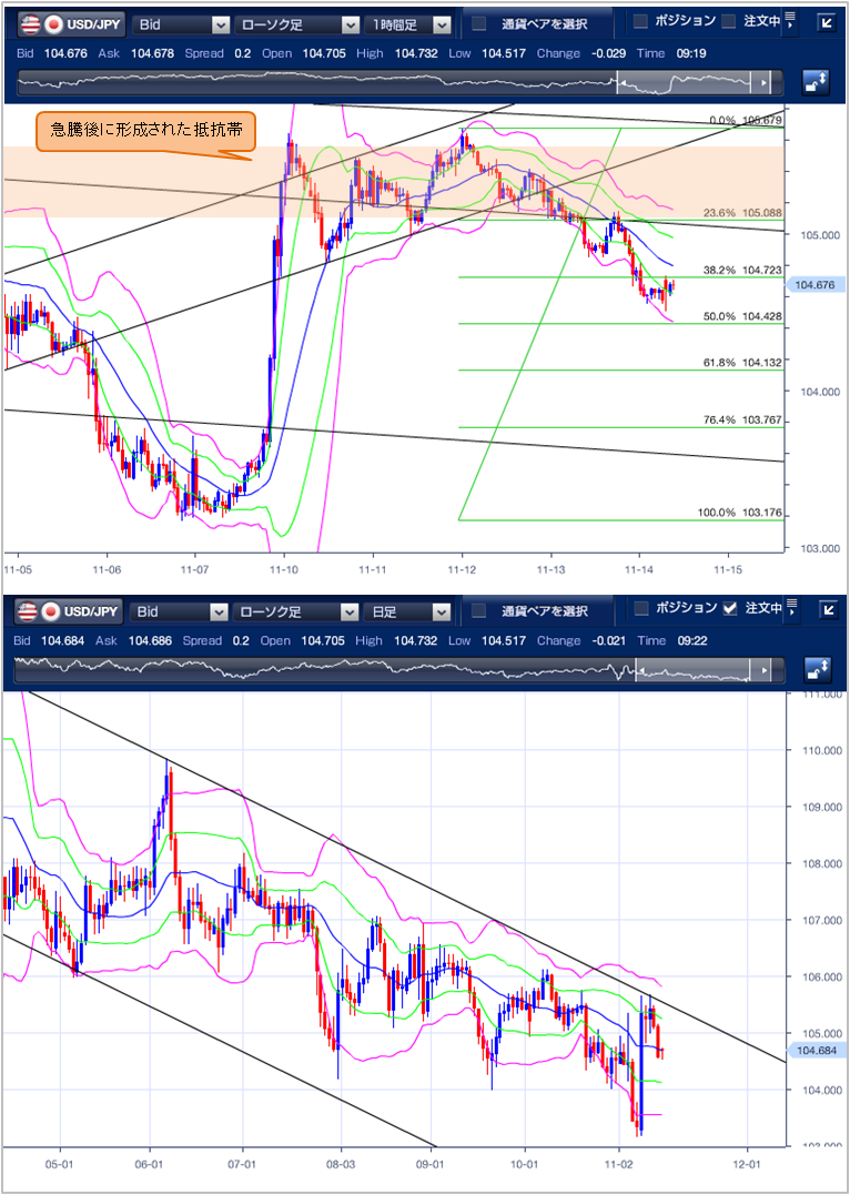 ◆米指標の悪化を受けて104.56円まで下落 ==================== 先週末(11月13日)のドル円相場は、東京時間の高値が意識された頭の重い展開が続き、米指標の悪化を受けて104.56円まで下落しました。 東京市場は、下落。日経平均株価が下落し、クロス円が全般売られたことにつれて、前日安値の105.06円を下抜けると104.85円まで下落しました。 欧州市場は、頭が重い。序盤に一時105.15円付近まで上げたものの、アジア時間に付けた105.13円が意識されると、ドル売りが優勢となり、伸び悩む展開となりました。 NY市場は、続落。22時30分に発表された10月卸売物価指数(PPI)は予想を上回ったものの、食品とエネルギーを除くコア指数が予想を下回ったため、円買い・ドル売りが優勢となり、10日安値104.82円を下抜けると目先のストップロスを巻き込んで、104.56円と日通し安値を付けました。 テクニカル(ドル円1時間足チャート)でみると、ボリンジャーバンドは、右肩下がりとなっており、11/10を起点としたサポートラインを割り込んでいることから下落を示唆しています。 日足チャートで見ると、3/24を起点としたレジスタンスラインを抜けきることができず、ダウントレンドを継続しています。 以上のことから、本日の下値目途は、6日安値の103.17円から11日高値105.67円の50.0%押しとなる104.42円、下抜けた場合は、61.8%押しとなる104.13円が次のターゲットとなりそうです。 上値目途は、23.6%押しとなる105.08円、上抜けた場合、大統領選後の急騰後に形成された105円台半ばの抵抗帯がターゲットとして意識されそうです。 ※チャートは、ドル/円の一時間足ボリンジャーバンドを表示しています。