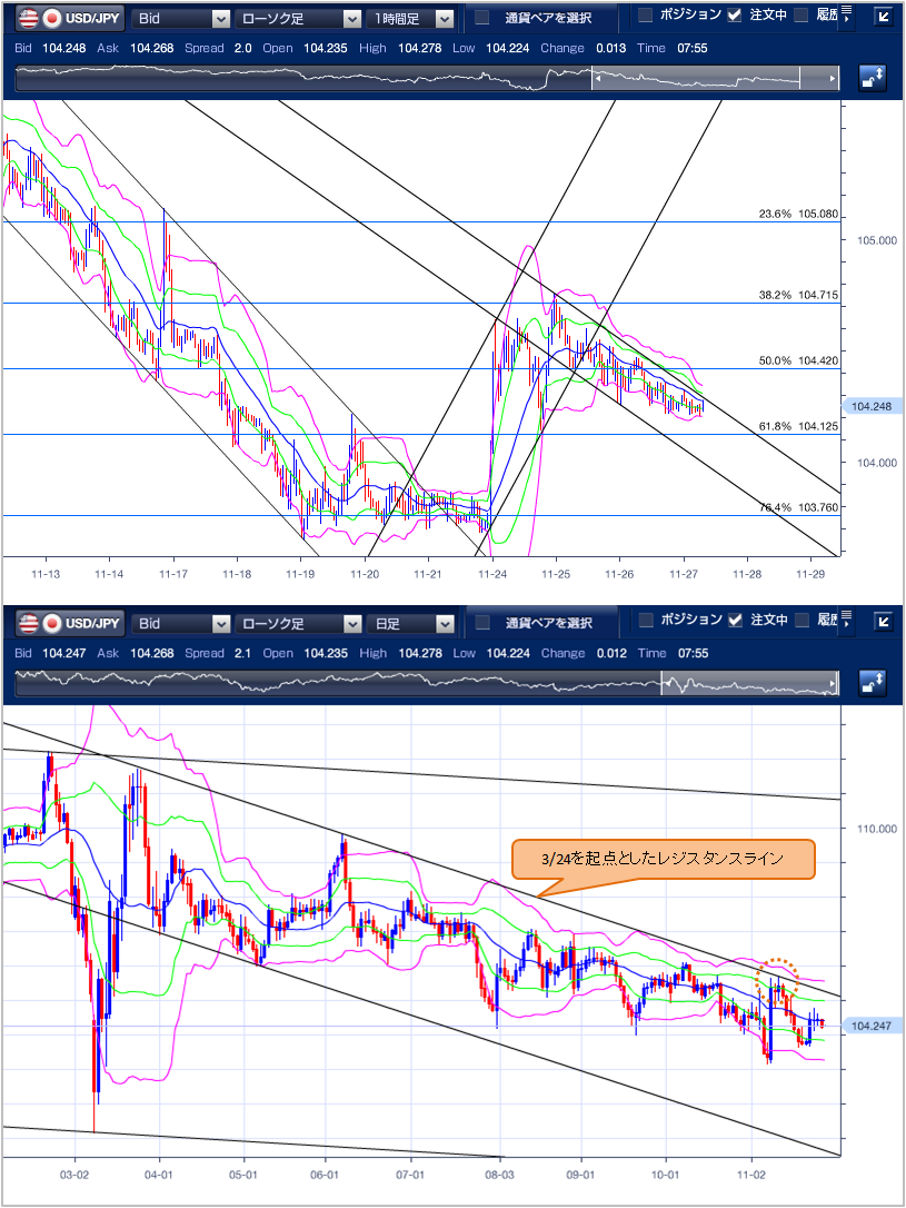 ◆米国感謝祭に入り、104円台前半で動意に欠ける展開 ========================== 昨日(11月26日)のドル円相場は、米国が感謝祭で祝日となり、1日の値幅も104.20円〜104.46円の26銭幅と動意に欠ける展開となりました。 東京市場は、弱含み。米国が感謝祭で休場となることから持ち高調整の売りが持ち込まれ前日安値の104.25円までじり安の展開でしたが、その後は104.30円台でのもみ合いとなりました。 欧州市場は、特段材料もなく104.22円〜104.35円の13銭幅で推移しました。 NY市場は感謝祭で休場となったことから、104.20円〜104.31円のわずか11銭幅で推移しました。 テクニカル(ドル円1時間足チャート)でみるとボリンジャーバンドは右肩下がりとなっており、下落を示唆しています。 日足チャートで見ると、3/24を起点としたレジスタンスラインの下で推移しており、下落トレンドが継続していることがわかります。 以上のことから、本日の下値目途は、6日安値の103.17円から12日高値105.67円の61.8%押し となる104.12円、下抜けると76.4%押しとなる103.76円が次のターゲットとなります。 上値目途は、38.2%押しとなる104.71円、上抜けた場合は、23.6%押しとなる105.08円がターゲットとなります。 ※チャートは、ドル/円の一時間足ボリンジャーバンドを表示しています。