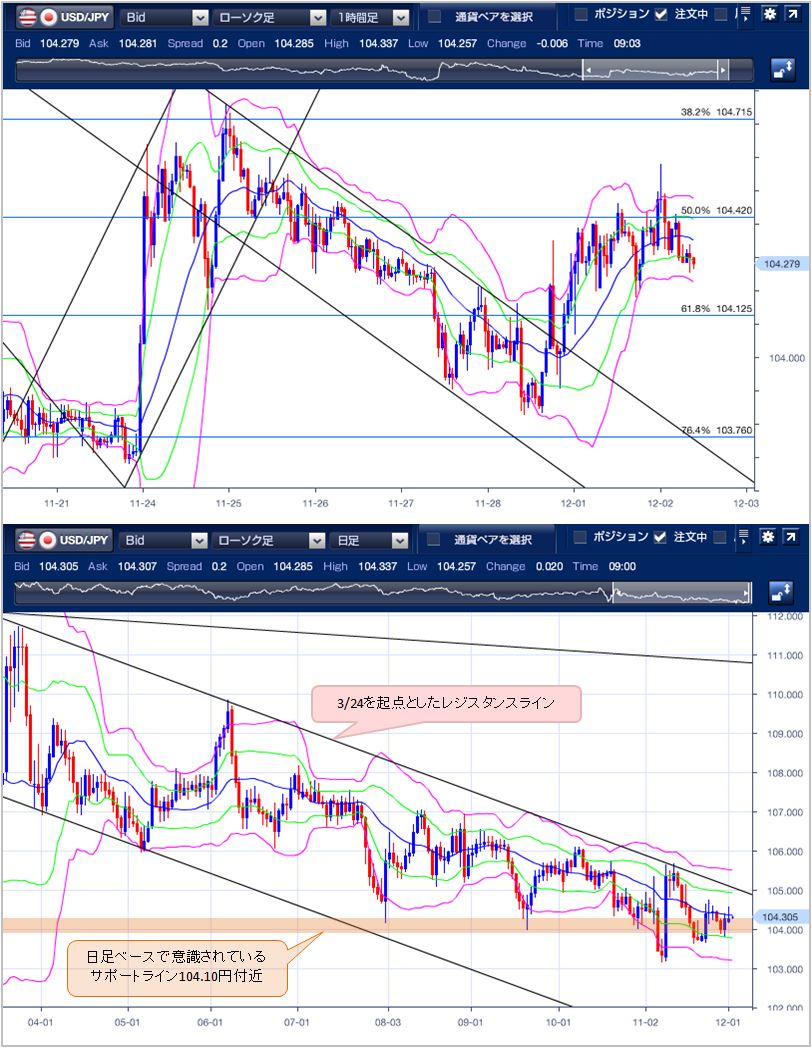 ◆104.18円から104.57円の39銭幅で方向感に欠ける展開 ============================ 昨日(12月1日)のドル円相場は、株価の堅調な推移から円売りが優勢となり、上昇するも、104円半ばからの戻り売りに押され、104.18円から104.57円の39銭幅で方向感に欠ける展開となりました。 東京市場は、小高い。日経平均株価が大幅に反発したことから、円売りが優勢となり、一時104.46円まで値を上げました。 欧州市場は、下値が堅い。104円台半ばからの戻り売りから、一時104.18円と日通し安値まで下落しましたが、欧州株価の上昇に伴った、リスク選好の円売りが優勢となり、104.43円まで切り返す展開となりました。 NY市場は、方向感なく推移。ダウ平均の堅調な推移から、円売り・ドル買いが優勢となり、 一時104.57円と日通し高値を付けたものの、戻り売り圧力は根強く、6時過ぎに104.28円まで下落し、NYをクローズしています。 テクニカル(ドル円1時間足チャート)でみると、ボリンジャーバンドは横ばいで方向感がないことを示唆しています。 日足チャートで見ると、3/24を起点としたレジスタンスラインの下で推移しており、下落トレンドが継続していることがわかります。 以上のことから、本日の下値目途は、6日安値の103.17円から12日高値105.67円の76.4%押しとなる103.76円となります。下抜けると、11/19安値の103.65円が次のターゲットとなります。上値目途は、50.0%押しとなる104.42円、上抜けた場合は、38.2%押しとなる104.71円が次のターゲットとなります。 ※チャートは、ドル/円の一時間足日足ボリンジャーバンドフィボナッチを表示しています。