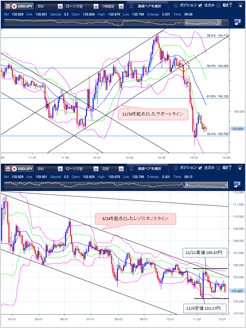 ◆11月18日以来、約2週間ぶりとなる103.67円まで続落 =========================== 昨日(12月3日)のドル円相場は、104円を割り込み、11月18日以来、約2週間ぶりとなる103.67円まで続落しました。 東京市場は、104.37円〜104.53円のわずか16銭幅にとどまり、方向感を欠いた値動きとなりました。 欧州市場は、軟調推移。新型コロナワクチン実用化への期待からリスク選好のドル売りが優勢となり、104.22円〜104.48円と小幅に下落しました。 NY市場は、続落。欧州時間からのドル売りの流れが継続し、軟調推移の中で発表された、米11月ISM非製造業景況指数(結果55.9、予想56.0)の冴えない結果(6ヵ月ぶり低水準)を受けて、104円を割り込み、11月18日以来、約2週間ぶり安値となる103.67円まで続落しました。ただし、11月18日の安値103.65円が目先サポートとして意識されると下げ渋り、小幅に反発しましたが上値は重く、103.82円でNYをクローズしています。 テクニカル(ドル円1時間足チャート)でみると、ボリンジャーバンドは右肩下がりとなっており、11/30安値を起点としたサポートラインを割り込んで下落していることから、地合いの弱い展開となっています。ただし、 2σが収斂していることから、一旦は下げ止まりを見せています。 日足チャートで見ると、3/24を起点としたレジスタンスラインの下で推移しており、下落トレンドが継続していることがわかります。 以上のことから、本日の下値目途は、昨日(12/3)安値の103.67円となり、下抜けると、11/6安値の103.17円が次のターゲットとなります。上値目途は、11/6日安値の103.17円から11/11日高値105.67円の61.8%押しとなる104.12円となります。上抜けると、50.0%押しとなる104.42円が次のターゲットとなります。 ※チャートは、ドル/円の一時間足日足ボリンジャーバンドフィボナッチを表示しています。