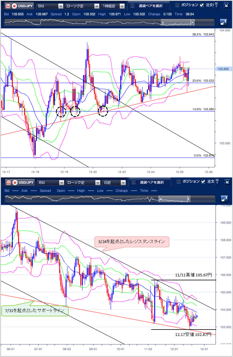 ◆クリスマス前日で取引閑散 103円半ばで小動き ======================= 昨日(12月24日)のドル円相場は、クリスマス前日で主要市場が取引時間短縮で閑散となる中、103円半ばを挟んで小動きが続きました。 東京市場はもみ合い。103.49円〜103.62円の13銭幅で方向感を欠いた値動きとなりました。 欧州市場は、103.54円〜103.69円の15銭幅で小幅に上昇しました。 クリスマス前日でロンドン市場が短縮取引となったこともあり、総じて動意に乏しい展開なりました。 NY市場は、英EU合意期待でダウ平均が上昇すると、投資家のリスク志向が高まり円売り・ドル買いが優勢となり、24時過ぎに一時103.76円と日通し高値をつけました。ただ、21日高値103.89円が意識されると上値を抑えられ、103.55円でNYをクローズしています。 テクニカル(ドル円1時間足チャート)でみると、ボリンジャーバンドは緩やかに上昇していますが、12/21高値となる103.89円を抜けることができず、依然上値の重さを確認できます。 また、日足チャートで見ると、3/24を起点としたレジスタンスラインの下で推移しており、現在も下落トレンドが継続していることがわかります。 以上のことから、本日の下値目途は、昨日(12/24)安値の103.44円となり、下抜けると下値として意識されてきた11/11日高値105.67円から12/17日安値102.87円の14.6%戻しとなる103.28円が次のターゲットとなります。上値目途は、12/21高値の103.89円となり、同レベルにある38.2%戻しとなる103.94円を上抜けると、12/15高値となる104.15円が次のターゲットとなります。なお、日足で見ると、7月31日を起点としたサポートラインで、下げ止まりを見せていますが、このレベルを割り込むと目立ったサポートが無いことから、急落する可能性もあるため、注意が必要です。 ※チャートは、ドル/円の一時間足日足ボリンジャーバンドフィボナッチを表示しています。