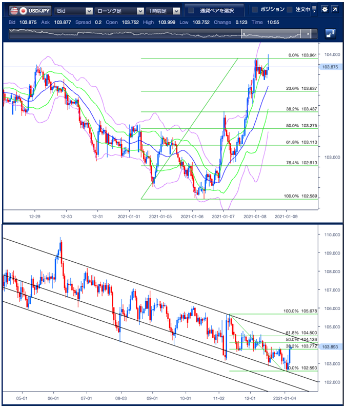 以上のことから、本日の下値目途は、1/6安値102.59円から1/7高値の103.95円の23.6%押しとなる103.64円、下抜けると38.2%押しの103.43円、さらに50%押しとなる103.27円付近がターゲットとなります。上値目途は、昨日(1/7)高値の103.95円となり、上抜けると、11月11日高値105.67円から1/6安値102.59円の50.0%戻しとなる104.13円が次のターゲットとなります。