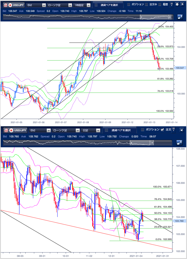 また、日足チャートで見ると1/6安値102.59円から1/11高値の104.39円の38.2%押しとなる103.77円まで下落する展開となっています。