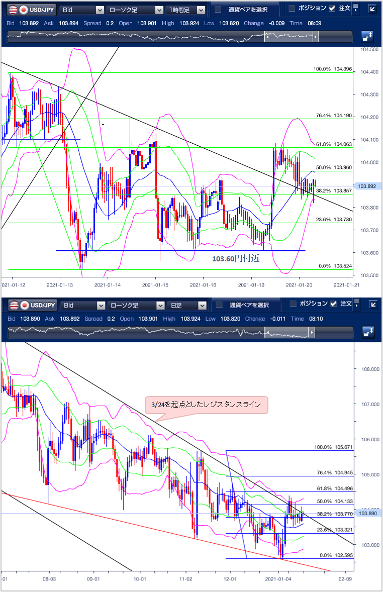 ◆上昇するも104円前半は上値が重い ================== 昨日(1月19日)のドル円相場は、堅調な株価の上昇を背景に104.08円まで上昇するも、104円前半では上値が重く、徐々に上値を切り下げる展開となりました。 東京市場は上昇。日経平均株価の堅調な動きを背景にリスク選好の円売りが優勢となり、104.08円まで上昇しました。 欧州市場は次期財務長官に指名されたイエレン氏の承認公聴会を控えて、103.94円〜104.08円と14銭幅の狭い値動きとなりました。 NY市場はイエレン次期財務長官候補の指名承認公聴会において、目新しい発言もなかったことから相場の反応は限られました。ただし、バイデン次期大統領の就任式を控えた警戒感もあり、104.04円から103.83円まで下落しました。その後も104円台を回復することはできず103.90円でNYをクローズしています。 テクニカル(ドル円1時間足チャート)でみるとボリンジャーバンドは中心線が上昇し、スクイーズを形成していることから方向感がないことを示唆しており、上値の重さを確認できます。1/11高値104.39円から11/13安値103.52円の61.8%戻しとなる104.07円付近で何度か上値を抑えられていることから、104円前半付近の水準では戻り売りが旺盛なことが伺えます。また、下値では103.60円付近で何度かサポートされていることから、目先の下値目途として意識されています。日足チャートで見ると、3/24を起点としたレジスタンスライン付近で推移しており、明確に上抜けることができればトレンドの転換の可能性が大きくなります。 以上のことから本日の下値目途は103.60円となり、下抜けると1/6安値102.59円から1/11高値の104.39円の23.6%押しとなる103.32円が次のターゲットとなります。 上値目途は50%押しとなる104.13円となり、上抜けると51/11高値104.39円が次のターゲットなります。 ※チャートは、ドル/円の一時間足日足ボリンジャーバンドフィボナッチを表示しています。