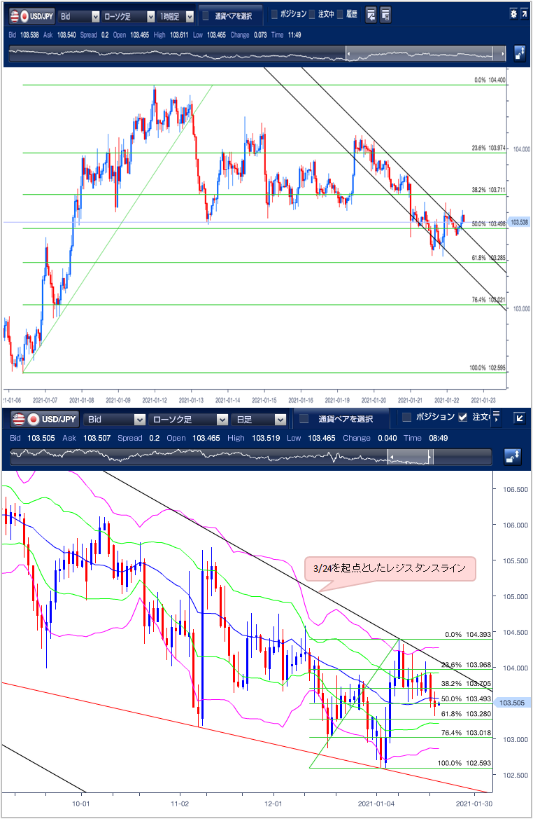 ◆1/7以来、2週間ぶりの安値103.32円まで下落 ======================= 昨日(1月21日)のドル円相場は、堅調な株価を背景にしたリスク選好のドル売りで1/7以来、2週間ぶりの安値103.32円まで下落しましたが、下値も堅く103.32円〜103.66円と34銭幅でもみ合いとなりました。 東京市場は日経平均株価が一時320円超まで上昇したことを背景に円売りが優勢となり103.66円まで上昇しましたが、戻り売りに押され103.33円まで下落し上値の重い展開となりました。 欧州市場は特段材料はなく103.36円〜103.55円と19銭幅で方向感なく推移しました。 NY市場は米1月フィラデルフィア連銀製造業景気指数(結果26.5、予想11.5)、米新規失業保険申請件数(結果90.0万件、予想91.0万件)が軒並み良好な結果が出るとドル買いが優勢となり、東京時間高値となる103.66円まで反発しました。ただし、上値は重く103.45円まで下落してNYをクローズしています。 テクニカル(ドル円1時間足チャート)でみるとボリンジャーバンドは中心線が下落しており、1/19高値を起点としたレジスタンスラインで上値が抑えられていることから、上値の重い展開を示唆しています。 日足チャートで見ても、3/24を起点としたレジスタンスラインの下で推移しており、上値の重い展開が継続していることがわかります。 以上のことから本日の下値目途は前日のレポートにもある通り、引き続き1/6安値102.59円から1/11高値の104.39円の61.8%押しとなる103.28円。 また、昨日(1/21)の安値103.32円もあることから103.30円付近が第1ターゲット、下抜けると1/7の安値102.95及び76.4%押しとなる103.02円の103円を挟んだエリアが次のターゲットとなります。 上値目途は38.2%押しとなる103.70円となり、上抜けると23.6%押しとなる103.96円が次のターゲットなります。 ※チャートは、ドル/円の一時間足日足ボリンジャーバンドフィボナッチを表示しています。