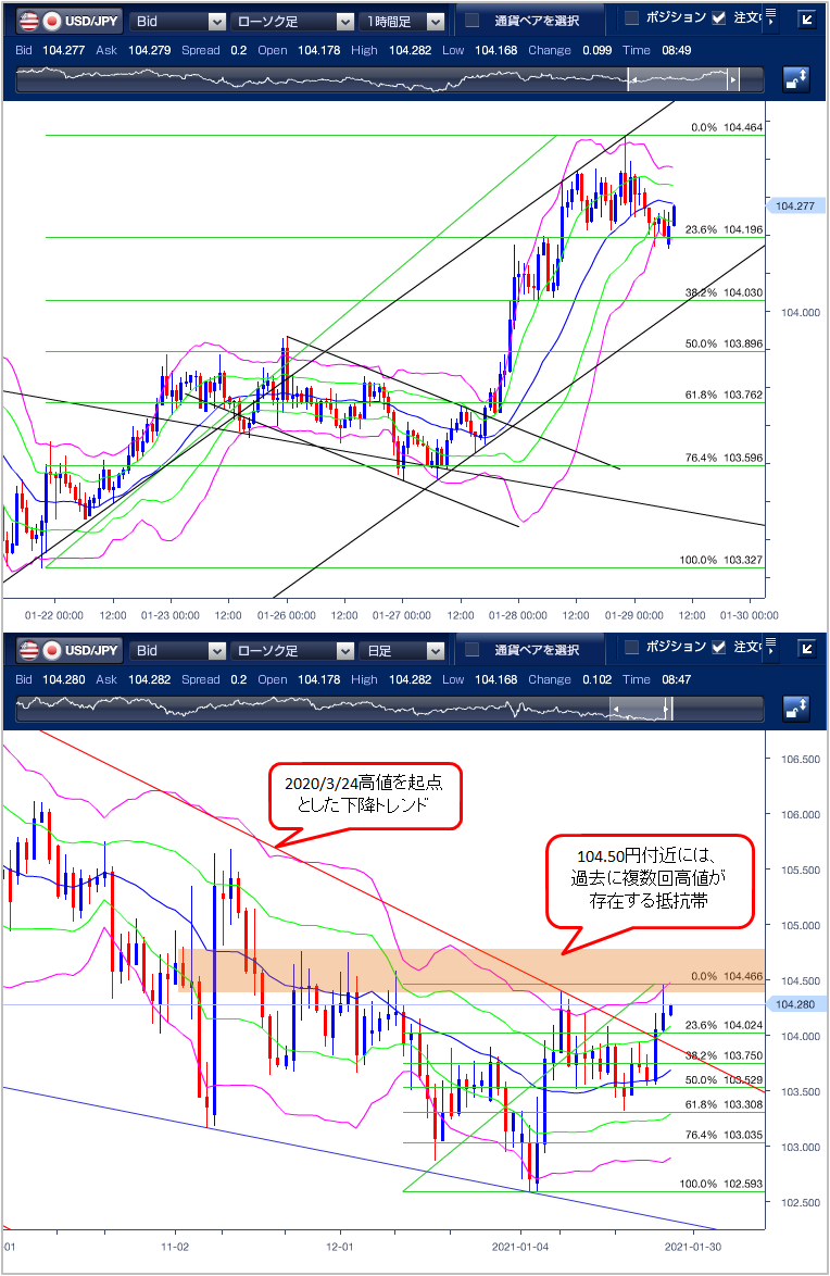 以上のことから本日の下値目途は、1/21安値103.32円から1/28高値104.46円の38.2%押しにあたる104.02円がターゲットとなり、下抜けると50%押しとなる103.89円が第2のターゲットとなります。上値目途は、昨年12/10高値となる104.57円がターゲットとなり、上抜けると12/2高値の104.75円が次のターゲットとなります。ただし、104.50円付近には、昨年から複数回にわたり高値が存在している抵抗帯があるため、上値の重い展開が予想されます。