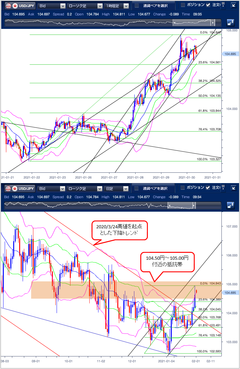 ◆昨年11月16日以来の高値104.94円まで上昇 ======================= 先週末(1月29日)のドル円は軟調な株価を背景にしたリスク回避のドル買いから、昨年11月16日以来の高値104.94円まで上昇しました。 東京市場は上昇。高く始まった日経平均株価が下げに転じ、ダウ先物が軟調に推移したことを背景にリスク回避目的のドル買いが優勢となり、104.56円まで上昇しました。 欧州市場は続伸。欧州勢は東京市場の流れを引き継ぎ、ドル買い円売りで参入すると、昨年11月16日以来の高値104.94円まで上昇しました。しかしながら105円手前では、戻り売りも意欲も旺盛で、上値の重い展開となりました。 NY市場は高値圏でもみ合い。オセアニア通貨に対してドル売りが先行し、104.61円付近まで下押ししたもののダウ平均が一時740ドル超下落し節目の3万ドルを割り込んだことでリスク回避的なドル買いが優勢となり、104.85円付まで持ち直す展開となりました。 テクニカル(ドル円1時間足チャート)でみるとボリンジャーバンドは、右肩上がりとなっており上昇を示唆しています。日足チャートでは、2020/3/24を起点としたレジスタンスラインを上抜けており、上昇トレンドを形成しつつあります。 以上のことから本日の下値目途は、1/21安値103.32円から1/29高値104.94円の23.6%押しにあたる104.56円がターゲットとなり、下抜けると38.2%押しとなる104.32円が第2のターゲットとなります。上値目途は、1/29高値の104.94円となり、上抜けると、11/16高値の105.13円が次のターゲットとなります。ただし、104.50円〜105.00円付近には、昨年から複数回にわたり高値が存在している抵抗帯があるため、上値の重い展開が予想されます。 ※チャートは、ドル/円の一時間足日足ボリンジャーバンドフィボナッチを表示しています。