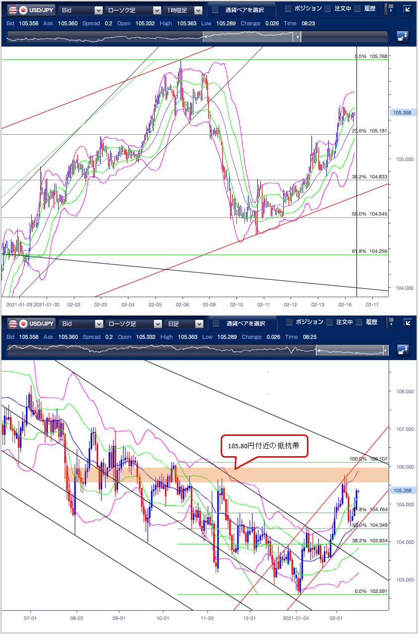 ◆株高でリスク選好の円売り強まる ================ 昨日(2月15日)のドル円は世界的な株高を背景にリスク選好の円売り・ドル買いが優勢となり、8日以来の高値となる105.41円まで上昇しました。 東京市場ではドル円は強含み。新型コロナウイルスワクチン普及から早期収束期待で日経平均株価が約30年半ぶりに終値で3万円台を付ける株高が進行し、投資家のリスク選好の円売りが優勢となり105.18円まで上昇しました。 欧州市場は続伸。米追加経済対策期待から、欧州時間朝方にかけて8日以来の高値となる105.41円まで上昇しました。 NY市場は米国やカナダがそれぞれプレジデンツデーとファミリーデーで休場となったことで市場参加者が激減し、105.26円〜105.40円の14銭幅で105.30円を挟んだ小動きとなり105.35円でNYをクローズしています。 テクニカル(ドル円1時間足チャート)でみるとボリンジャーバンドは、中心線が上昇していますが、±2σが収斂しており上値が重いことを示唆しています。日足チャートにおいてもボリンジャーバンドの右肩上がりではあるものの、過去高値が複数存在する105.80円付近の抵抗帯で上値を抑えられており、このレベルでは上値の重い展開が予想されます。 以上のことから本日の下値目途は1/21安値103.32円から2/5高値105.76円の23.6%押しにあたる105.19円が第1ターゲット、38.2%押しにあたる104.83円が第2ターゲットとなります。 下抜けると50.0%押しとなる104.54円が第3のターゲットとなります。上値目途は昨日(2/15)高値の105.41円となり、上抜けると2/5高値の105.76円が次のターゲットとなります。以前から記載しているように105.80円付近には過去高値が複数存在する抵抗帯が存在しているため、このレベルでは上値の重い展開が予想されます。 ※チャートは、ドル/円の一時間足日足ボリンジャーバンドフィボナッチを表示しています。