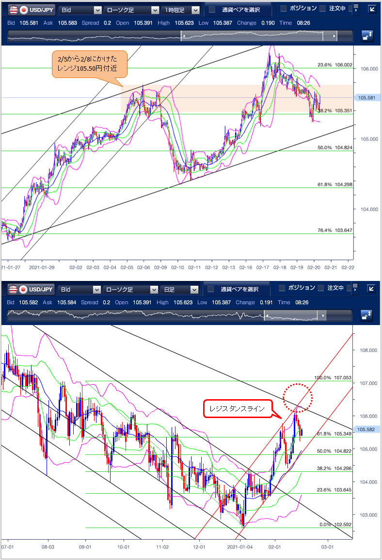 ただし以前から記載しているように、2/5から2/8にかけて揉み合った105.50円付近のレンジがサポートとして機能しており、ここを明確に下抜けるかに注目です。