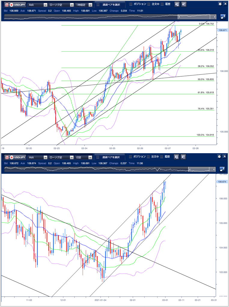 ◆昨年8月28日以来、約半年ぶりの高値106.75円まで急伸 ============================ 先週末(2月26日)のドル円は米経済回復期待からドル買いが先行し、昨年8月28日以来、約半年ぶりの高値となる106.75円まで急伸しました。 東京市場は荒い値動き。時間外の米10年債利回りが1.55%台まで上昇したことを受けて106.43円まで上昇するも日経平均株価の大幅反落を受け、リスク回避の円買いが優勢となり、105.84円まで反落する荒い展開となりました。 欧州市場は上昇。序盤では欧州株安を背景にしたリスク回避の円買いが優勢となり、106.00円まで下落する場面もありましたが、一時下落していた時間外取引の米10年債金利が1.45%台から1.48%台に持ち直すとドル買いが先行し106.52円まで上昇しました。 NY市場は4日続伸。ダウ平均が490ドル超下落するとリスク回避のドル買いが優勢となり、昨年8月28日以来約半年ぶりの高値となる106.69円まで上昇しました。引けにかけて小反落するも下値は堅く、106.39円でNYをクローズしています。 テクニカル(ドル円1時間足チャート)でみると、ボリンジャーバンドの中心線が上向きで上昇を示唆しています。日足チャートにおいてボリンジャーバンドは右肩上がりとなっており、上昇を示唆しています。また、前回(2/26)掲載したように、昨年2/20を起点としたレジスタンスラインを上抜けていることからさらなるドル買いが強まる可能性があります。 以上のことから本日の下値目途は2/23安値の104.92円から2/26高値106.75円の23.6%押しにあたる106.31円、下抜けると38.2%押しとなる106.05円となります。高値のめどは週末(2/26)高106.75円となり、上抜けると8/28高値となる106.94円が次のターゲットとなります。 ※チャートは、ドル/円の一時間足日足ボリンジャーバンドフィボナッチを表示しています。