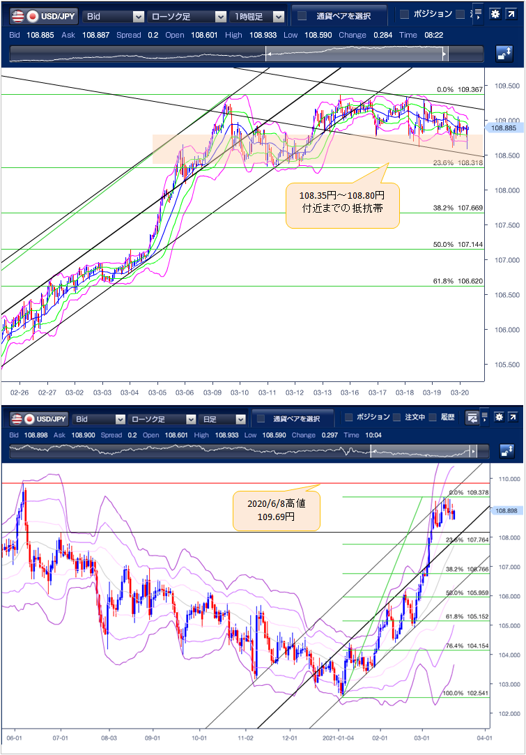 ◆108円後半で方向感を欠いた展開 ================ 先週末(3月19日)のドル円は軟調な株式相場を背景にリスク回避を目的とした取引が続き、108.60円〜109.12円の52銭幅で方向感を欠いた展開となりました。 東京市場は日銀の金融政策決定会合を前に方向感に欠けた値動きが続きました。 日銀の金融政策決定会合では前日の報道通り(長期金利の変動許容幅を±0.25%に拡大・ETFの買い入れ額目安を撤廃)の内容でサプライズはありませんでした。 発表直後には109.13円まで瞬間的に上昇しましたが次第に上値の重い動きとなり、日経平均株価が600円近く下落したことで円買いが優勢となると108.83円まで下落する展開となりました。 欧州市場は日経平均株価が大幅下落したことで円買いが優勢となり108.60円まで下落しました。 ただ、その後米10年債利回りが1.74%台まで上昇するとドル買い戻しが先行し、108.92円まで値を戻す展開となりました。 NY市場はダウ平均株価の下落を背景に米長期金利が上昇したことでリスク回避のドル買いが優勢となり、109.04円まで上昇しました。 その後は週末を控えたポジション調整の動きが続き、108円後半の狭いレンジでの取引が続きました。 テクニカル(ドル円1時間足チャート)でみるとボリンジャーバンドの中心線が下向きとなっており、下落を示唆しています。 日足チャートで見るとボリンジャーバンドは右肩上がりで上昇を示唆しています。 ただ、3/15高値の109.36円を前に上値の重い展開となっています。 以上のことから本日の下値目途は2/23安値の104.92円から3/15高値109.36円の23.6%押しにあたる108.31円となり、下抜けると3/5安値の107.82円が次のターゲットとなります。 高値の目途は3/15高値の109.36円となり、上抜けると昨年6/8高値となる109.69円が次のターゲットとなります。 ※チャートは、ドル/円の一時間足日足ボリンジャーバンドフィボナッチを表示しています。