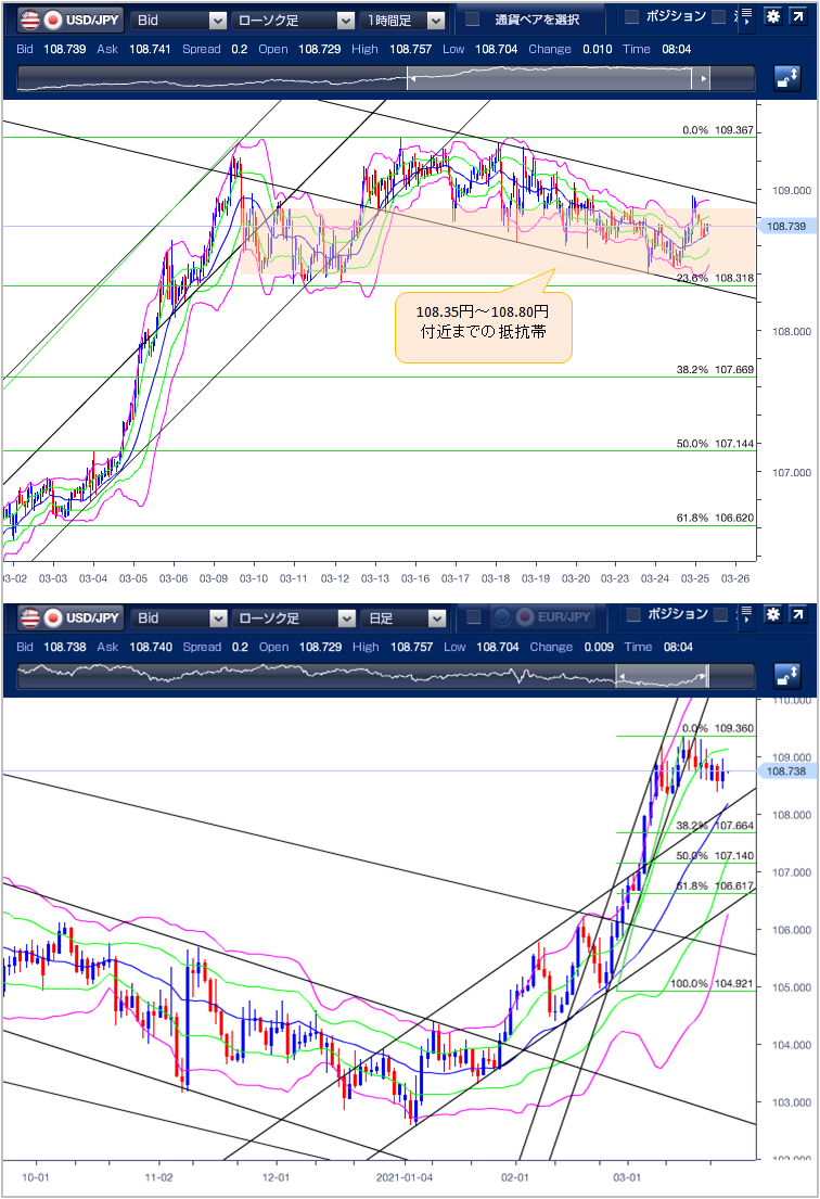 ◆前日高値を上抜けるも上値の重い展開が続く ===================== 昨日(3月24日)のドル円は米長期金利の上昇を背景として前日の高値108.87円を上抜けて108.95円まで上昇するも、米長期金利の軟調な推移から上値の重い展開となり108円後半でもみ合いとなりました。 東京市場は特段大きな材料はなく108.45円〜108.64円と19銭幅の狭いレンジでもみ合いとなりました。 欧州市場は軟調推移だった米10年債利回りが1.61%台へ低下幅を縮小するとドル買いが先行し、108.75円まで上昇しました。 NY市場はイエレン米財務長官およびパウエルFRB議長が議会証言で米国経済の回復に自信を示したことで米10年債利回りが1.6489%まで上昇したことを背景にドル買いが先行し、前日の高値108.87円を上抜けて108.95円まで上昇しました。 その後米10年債利回りが低下に転じると一転ドル売りが優勢となり108.66円まで下落しました。引けにかけて小反発するも上値は重く108.72円でNYをクローズしています。 テクニカル(ドル円1時間足チャート)でみるとボリンジャーバンドの中心線が上向きとなっており、上昇を示唆しています。ただし-2σが収斂しており上値の重い展開が予想されます。日足チャートで見るとボリンジャーバンドは中心線が上向きで上昇を示唆しています。 以上のことから本日の下値目途は2/23安値の104.92円から3/15高値109.36円の23.6%押しにあたる108.31円となり、下抜けると3/5安値の107.82円が次のターゲットとなります。高値の目途は、3/15高値の109.36円となり、上抜けると2020/6/8高値の109.69円が視野に入ります。 ※チャートは、ドル/円の一時間足日足ボリンジャーバンドフィボナッチを表示しています。