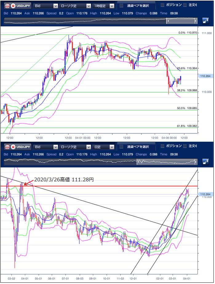 ◆ドルは下落し、一時110.00円割れを記録 ================= 昨日(4月5日)のドル円は下落し、一時109.95円と3月30日以来、約1週間ぶりの安値を記録しました。 東京市場ではもみ合い。110.63円で寄り付き後、一時は先週末の高値(110.74円)に面合わせする場面があったものの、その後は110.52円まで押し戻されています。 欧州市場では、イースターマンデー(復活祭)で主要市場が休場のため取引参加者が少なく、22銭(110.44〜110.68円)と狭い値幅での推移となりました。 NY市場に入ると急落。米長期金利の低下を受け、ポジション調整に伴うドル売りが加速し、23時台に一時109.95円と3月30日以来の安値を記録しました。 ただ、109円台では押し目買いの意欲も強く、引けにかけて値を戻し、110.17円でNYをクローズしました。 テクニカル(ドル円1時間足チャート)でみると、ボリンジャーバンドの中心線が下向きとなっており、下落を示唆していますが、日足チャートでの中心線は上向きとなっており、上昇トレンドが継続していることが分かります。 本日の下値目途は昨日と同様、3/23安値から3/31高値の38.2%押しとなる109.98円、下抜けた場合には50.0%押しとなる109.68円をみています。 高値の目途は、26.6%押しの110.36円、上抜けると3/31高値となる110.96円が次のターゲットとなります。 ※チャートは、ドル/円の一時間足日足ボリンジャーバンドフィボナッチを表示しています。