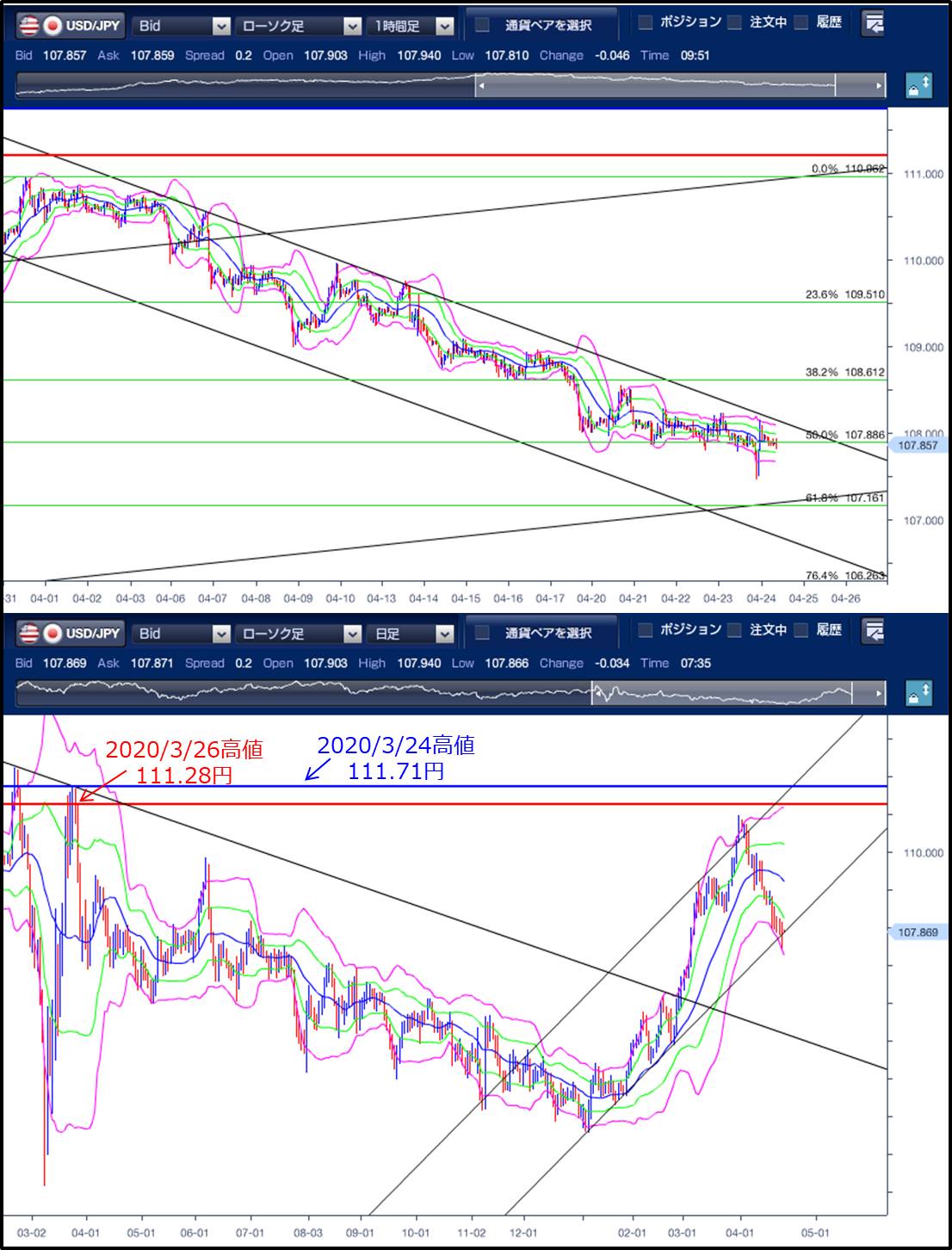 ◆往って来い。一時107.47円と3月4日以来の安値を記録 ================= 先週末(4月23日)のドル円は往って来い。一時107.47円と3月4日以来の安値をつけましたが、その後は反発し、108円を挟んで推移しました。 東京市場は軟調。前日からの流れを引き継ぎ朝方からドル売り優勢となり、一時107.80円と前営業日の安値107.81円に面合わせしました。 海外市場では往って来い。特段材料のないなか、NY勢が参入後はドル売り優勢となり、サポートとして意識されていた107.80円台を下抜けたことでストップを巻き込み急落し、22時前に3月4日以来の安値107.47円をつけました。 その後は売りが一巡し、急反発となりました。4月米製造業・サービス部門購買担当者景気指数(PMI)速報値や3月新築住宅販売件数(前月比)が良好な結果となったことでドル買いが加速し、24時前に108.14円と日通し高値をつけました。 ただし、108円台ではドル売り意欲が強く、引けにかけては107円台後半で推移し、107.86円でNYをクローズしました。 テクニカル(ドル円1時間足チャート)でみると、ボリンジャーバンドの中心線は緩やかな右肩下がりでスクイーズとなっており、目先はもみ合いを示唆しています。日足チャートでは右肩下がりとなっており、-2σと-1σの間で推移しているため、売り優勢を示唆しています。 本日の下値目途は4/23安値である107.47円、下抜けた場合には2/23安値(104.92円)から3/31高値(110.96円)のフィボナッチ61.8%押しとなる107.22円をみています。 高値目途は4/21と4/22、4/23の高値近辺である108.20円付近、上抜けると38.2%押しとなる108.65円が次のターゲットとなります。 ※チャートは、ドル/円の一時間足日足ボリンジャーバンドフィボナッチを表示しています。