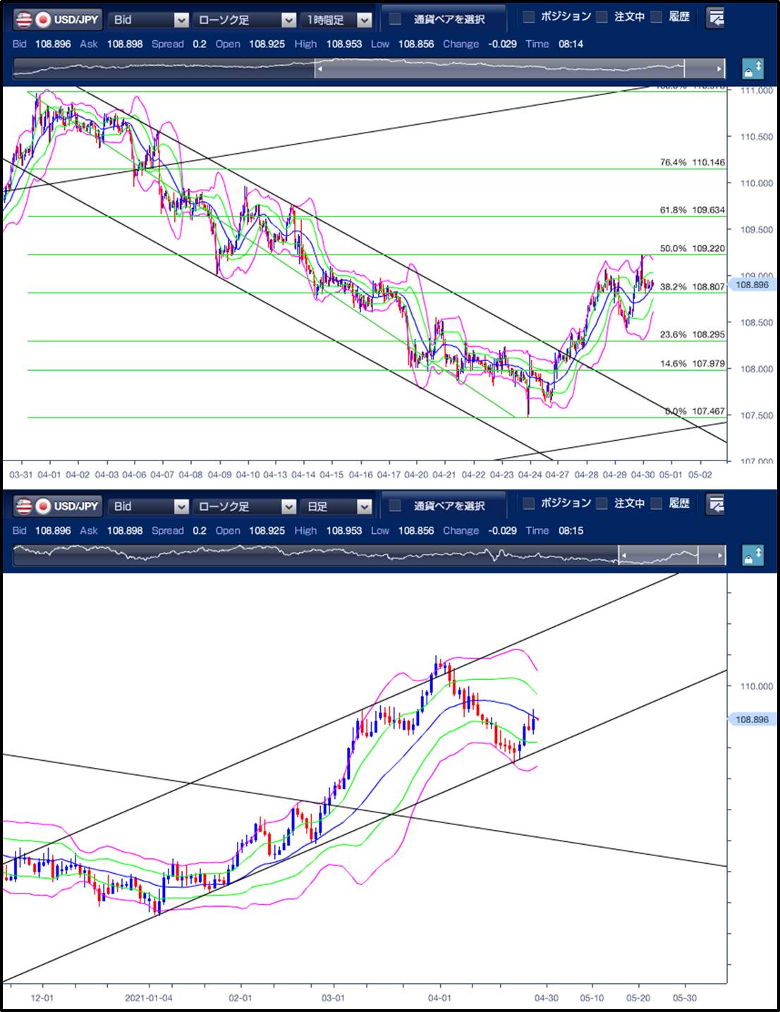 ◆上昇。一時109.22円と4/13以来の高値を記録 ================= 昨日(4月29日)のドル円は続伸し、一時109.22円と4/13以来の高値を記録しました。 東京市場は上昇。前日からの流れが継続したことで朝方からドル売り優勢となり、一時は108.43円まで下落しましたが、その後は利食いのドル買いが入り108.66円まで反発しました。 海外市場でもドル買いは継続。欧州勢が参入後もドル買いは続き、18時頃に109.06円まで上昇しました。 その後、ドル買いが一巡したことで一旦は108.83円まで反落したものの、21時半に発表された1-3月期四半期実質国内総生産(GDP、速報値)が前期比年率6.4%増と予想の6.1%増を上回ったことでドル買い優勢となり、21時前に日通し高値となる109.22円まで上昇しました。 その後は、利食いのドル売りに押されて108.80円まで反落し、108.92円でNYをクローズしました。 テクニカル(ドル円1時間足チャート)でみると、ボリンジャーバンドの中心線は右肩上がりでスクイーズとなっており、目先はもみ合いを示唆しています。日足チャートでは緩やかな右肩下がりとなっていますが、中心線を抜けて 1σまで上昇するかに注目です。 本日の下値目途は、3/31高値(110.96円)から4/23安値(107.47円)からのフィボナッチ38.2%戻しとなる108.80円、下抜けると23.6%戻しとなる108.29円がターゲットになります。 高値目途は50.0%戻し、かつ、前日高値付近でもある109.22円、上抜けると61.8%戻しとなる109.63円が次のターゲットとなります。 ※チャートは、ドル/円の一時間足日足ボリンジャーバンドフィボナッチを表示しています。