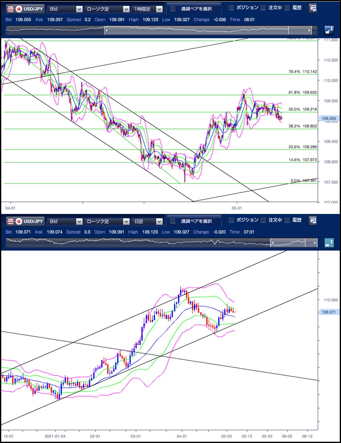 ◆続落。一時109円を下割れ ================= 昨日(5月6日)のドル円は続落し、108.99〜109.42円と軟調に推移しました。 東京市場は堅調。日経平均株価が上昇したことを受けてドル買い優勢となり、一時109.42円まで上昇しました。 海外市場は下落。欧州勢が参入後、米10年債利回りが低下したことでドル売り優勢となり、一時109.05円まで下落しました。 その後、21時半に発表された前週分新規失業保険申請件数が49.8万件と予想値54.0万件を下回ったことでドル買い優勢となり、日通し高値近辺の109.450円まで反発しました。ただ、東京市場の高値圏ではドル売り意欲が強く、その後は108.99円まで下落し、日通し安値を更新しました。 引けにかけても戻りは鈍く、109.08円でNYをクローズしました。 テクニカル(ドル円1時間足チャート)でみると、ボリンジャーバンドの中心線は右肩下がりとなっており、下落を示唆しています。一方、日足チャートではスクイーズとなっており、もみ合いを示唆しています。 本日の下値目途は、3/31高値(110.96円)から4/23安値(107.47円)のフィボナッチ38.2%戻しとなる108.80円近辺、下抜けると23.6%戻しとなる108.30円近辺がターゲットになります。 高値目途は5/4、5/5、5/6の高値となる109.40円台、上抜けると61.8%戻しとなる109.63円が次のターゲットとなります。 ※チャートは、ドル/円の一時間足日足ボリンジャーバンドフィボナッチを表示しています。