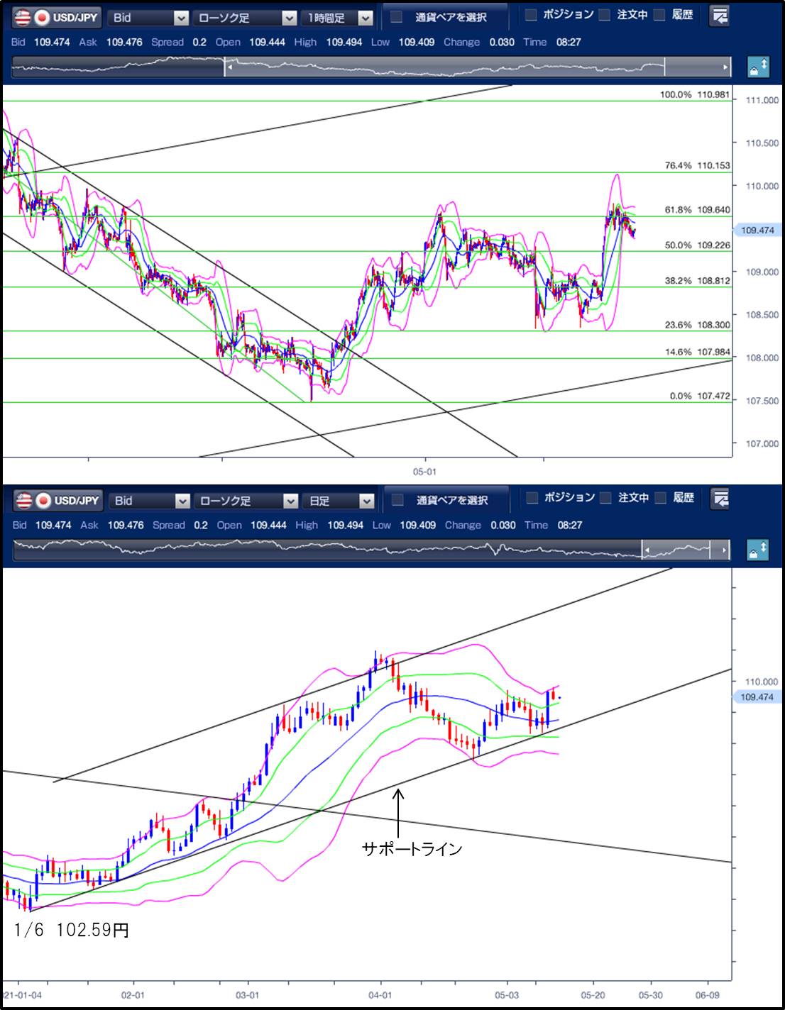 ◆109円台半ばでこう着 ================= 昨日(5月13日)のドル円は動意に乏しく、109.40〜109.78円の値幅で推移しました。 東京市場では、前日からの流れを引き継ぎ朝方からドル買い優勢となり、一時は109.78円まで上昇しましたが、その後は利食いのドル売りが入り109.48円まで反落しました。 海外市場は軟調。21時半に発表された4月米卸売物価指数(PPI)が前月比0.6%と予想の0.3%を上回ったことでドル買い優勢となり、109.69円まで値を戻しました。 その後、米10年債利回りが1.649%まで下落したことで上げが一服し、109.44円でNYをクローズしました。 テクニカル(ドル円1時間足チャート)でみると、ボリンジャーバンドの中心線は緩やかな右肩下がりでスクイーズとなっており、もみ合いを示唆しています。また、日足チャートの中心線は緩やかな右肩上がりで、買い優勢を示唆していますが、 2σが上値の抵抗帯として機能しており、110円台にのせるか否かに注目です。 本日の上値目途は、心理的な節目となる110.00円近辺、上抜けると3/31高値(110.96円)から4/23安値(107.47円)からのフィボナッチ76.4%戻しである110.15円をみています。 下値目途は5/4〜5/6の高値近辺で5/13の安値109.40円、下抜けると5/10、5/11高値近辺の109.00円が次のターゲットになります。 ※チャートは、ドル/円の一時間足日足ボリンジャーバンドフィボナッチを表示しています。