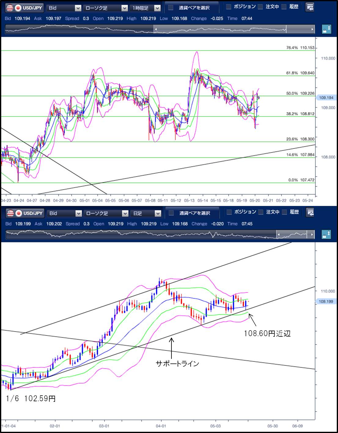 ◆5日ぶりに反発。前日の高値を更新し、往って来い。 ================ 昨日(5月19日)のドル円は5日ぶりに反発。前日(5/18)の高値を更新後に急落し、直近安値を更新。その後、急反発し前日高値近辺まで上昇し、往って来いとなりました。 東京市場は動意に乏しく、108.82〜109.07円でこう着状態となりました。 海外市場は往って来い。欧州勢が参入後、米10年債利回りが急上昇したことを受けてドル買い優勢となり、一時109.33円まで急騰しました。 その後は利食いのドル売りが入ったことや、NYダウが一時580ドル下落したことを受けたリスクオフの円買いドル売りが加速し、ストップを巻き込み108.56円まで急落しましたが、NYダウが反発したことからドル買戻しに転じ、108.90円まで値を戻しました。 また、米連邦公開市場委員会(FOMC)議事要旨(4/27-28開催)で「一部の参加者は米経済の急速な回復が継続した場合には、テーパリング(量的緩和の縮小)を巡る議論を開始することが適切になるとの考えを示した」ことが伝わるとドル買いは加速し、4時前に109.29円まで急騰しました。 テクニカル(ドル円1時間足チャート)でみると、ボリンジャーバンドの中心線は緩やかな右肩上がりとなっており、上昇を示唆しています。日足チャートの中心線も緩やかな右肩上がりで上昇を示唆しており、 1σを上抜けるかに注目です。 また、昨日のレポートで記載した108.60円近辺(サポートライン上)で反発しており、下値抵抗として機能していたことがわかります。 本日の上値目途は5/12、5/13の高値近辺である109.78円、上抜けた場合には3/31高値(110.96円)から4/23安値(107.47円)からのフィボナッチ76.4%戻しとなる110.15円をみています。 下値目途は5/19安値となる108.56円、下抜けると23.6%戻しとなる108.30円が次のターゲットになります。 ※チャートは、ドル/円の一時間足日足ボリンジャーバンドフィボナッチを表示しています。