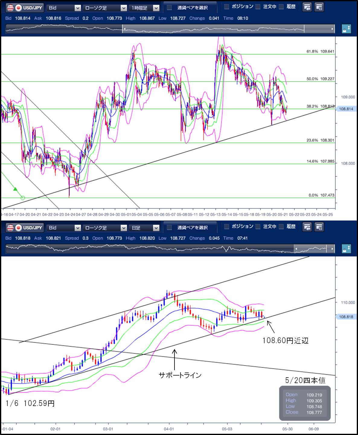 ◆109円台を維持できず反落 ================ 昨日(5月20日)のドル円は軟調に推移。米10年債利回りの下落や、予想を大幅に下回ったフィラデルフィア連現製造業景況指数を受けて、一時108.77円まで下落しました。 東京市場は動意に乏しく、109.09〜109.30円のレンジで推移しました。 海外市場は下落。欧州勢が参入後、米10年債利回りが下落したことでドル売り優勢となり、108.87円まで下落しました。その後、米10年債利回りが上昇に転じたことを受けて108円台後半でこう着状態となりましたが、21時半に発表された5月フィラデルフィア連銀製造業景気指数が31.5と予想の41.9を大きく下回ったことでドル売りが再燃し、108.75円まで下落しました。 その後も引けにかけて戻りは鈍く、108.77円でNYをクローズしています。 テクニカル(ドル円1時間足チャート)でみると、ボリンジャーバンドの中心線は右肩下がりとなっており、下落を示唆しています。一方、日足チャートの中心線は緩やかな右肩上がりでスクイーズを形成しており、もみ合いを示唆しています。 本日の下値目途は、5/19安値108.56円、下抜けると3/31高値(110.96円)から4/23安値(107.47円)のフィボナッチ23.6%戻しとなる108.30円が次のターゲットになります。また、108.30付近は5/7、5/11の安値でもあり、サポートラインとして意識されています。 上値目途は、3/31高値(110.96円)から4/23安値(107.47円)の50.0%戻しである109.22円、61.8%戻しとなる109.64円をみています。 また、108.60円近辺は1/6を起点としたサポートライン上となり、下抜けた場合には急落する可能性もあるので注意が必要です。 ※チャートは、ドル/円の一時間足日足ボリンジャーバンドフィボナッチを表示しています。