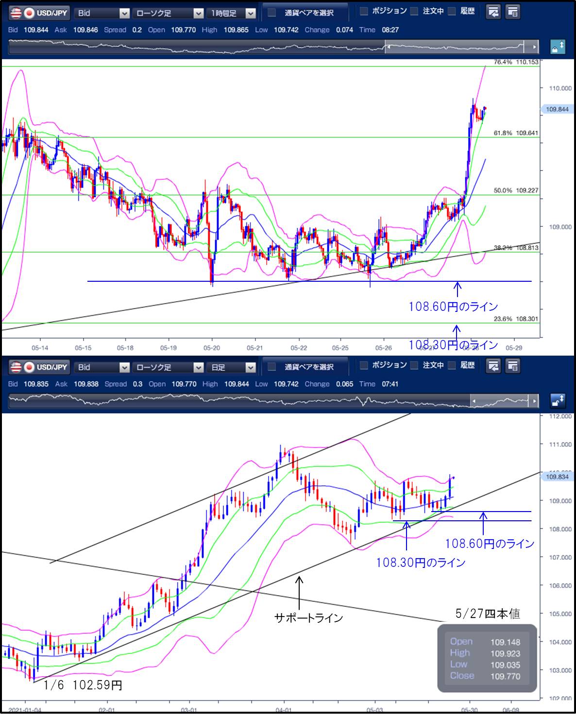◆急伸。バイデン米大統領の予算案拡大報道を受け、約1ヵ月半ぶりの高値を記録 ================ 昨日(5月27日)のドル円は急伸し、一時109.92円と4/9以来となる約1ヵ月半以来の高値を記録しました。 東京市場は動意に乏しく、109.04〜109.20円のレンジで推移しました。 海外市場は急伸。序盤は109円台前半でのもみ合いが続いていましたが、米ニューヨークタイムズ紙による「バイデン米大統領がインフラ拡充に6兆ドルの予算案を提案した」との報道を受けてドル円は急伸、一時109.92円と4/9以来となる約1ヵ月半以来の高値を記録しました。 また、上記の報道を受けた米10年債利回りが1.62%台まで上昇したことや、新規失業保険申請件数が42.5万件と予想44.4万件を下回ったこともドル買いの支援材料となりました。 ドル買い一服後も高値圏で推移し、109.77円でNYをクローズしました。 テクニカル(ドル円1時間足チャート)でみると、ボリンジャーバンドの中心線は右肩上がりで、上昇を示唆しています。日足チャートの中心線も緩やかな右肩上がりとなっており、上昇を示唆しています。また、 2σ近辺で推移しており、バンドウォークを形成して続伸するか否かに注目です。 本日の上値目途は心理的な節目となる110.00円近辺、上抜けると3/31高値(110.96円)から4/23安値(107.47円)のフィボナッチ76.4%戻しとなる110.15円近辺が次のターゲットになります。 下値目途は61.8%戻しとなる109.64円近辺、下抜けると50.0%戻しとなる109.22円近辺が次のターゲットになります。 ※チャートは、ドル/円の一時間足日足ボリンジャーバンドフィボナッチを表示しています。